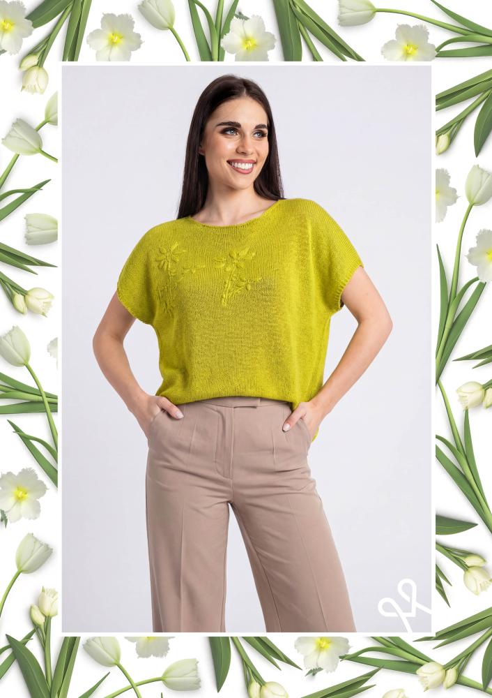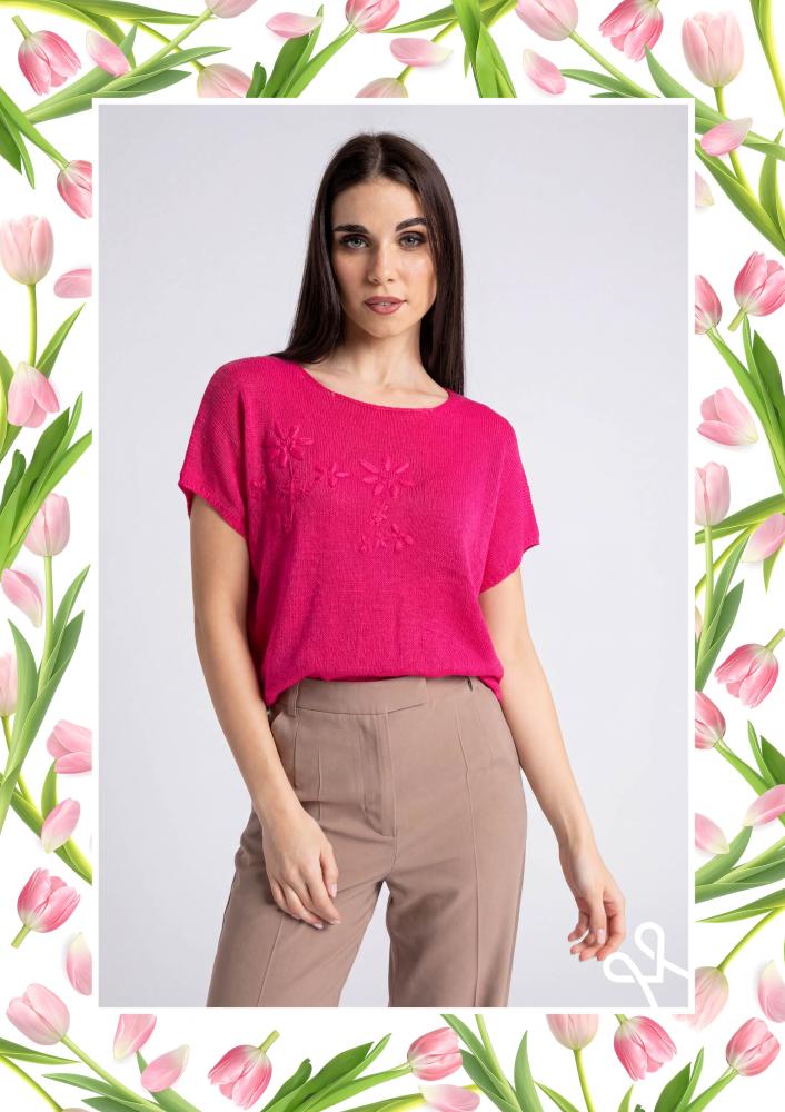 Málna színű, vékony kötésű, Magenta kötött felső, laza fazonú, kerek nyakkivágással, rövid ujjal, elején virág díszítéssel. Oldalán rávarrt textil Magenta márkajelzés.