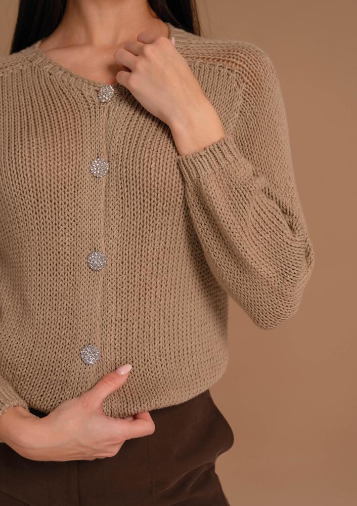 Bézs színű, kötött Magenta kardigán, kerek nyakkivágással, elején gombos záródással, hosszú ujjal. Oldalán rávarrt textil Magenta márkajelzés.