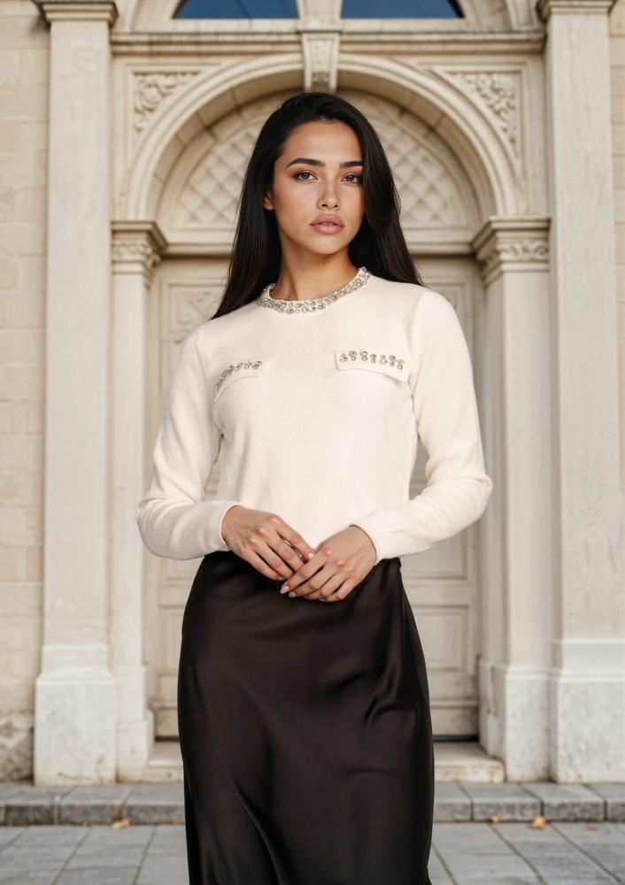 Bézs színű, kötött Magenta mellény, bő fazonú, garbó nyakkal, ejtett vállrésszel. Oldalán rávarrt textil Magenta márkajelzés.