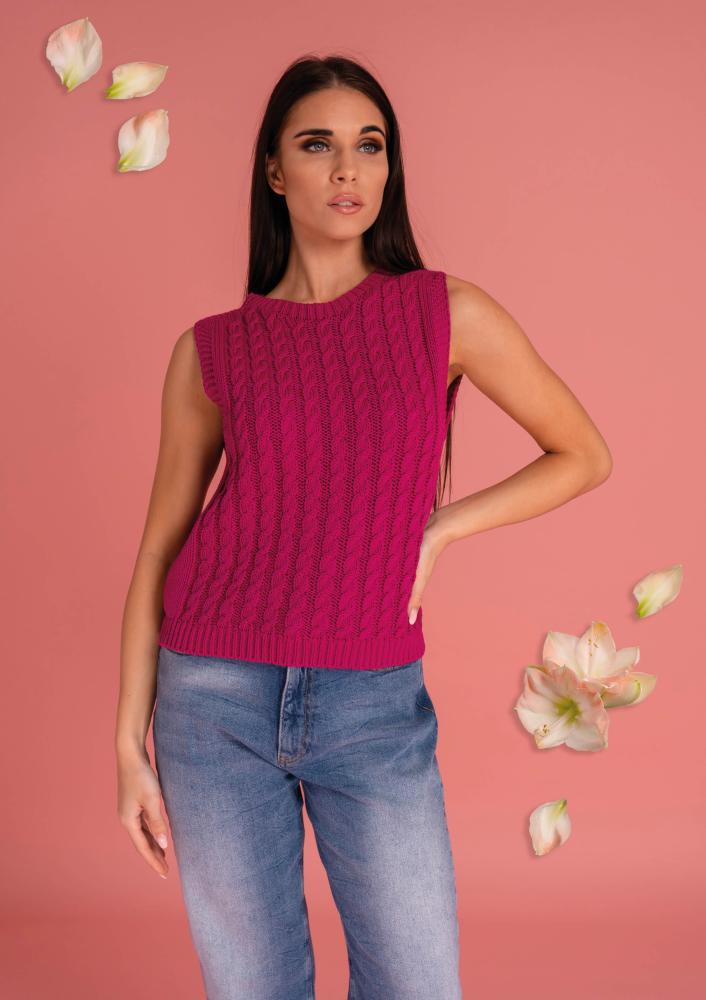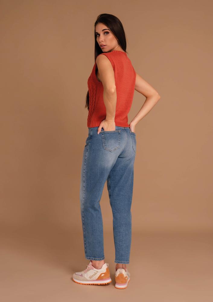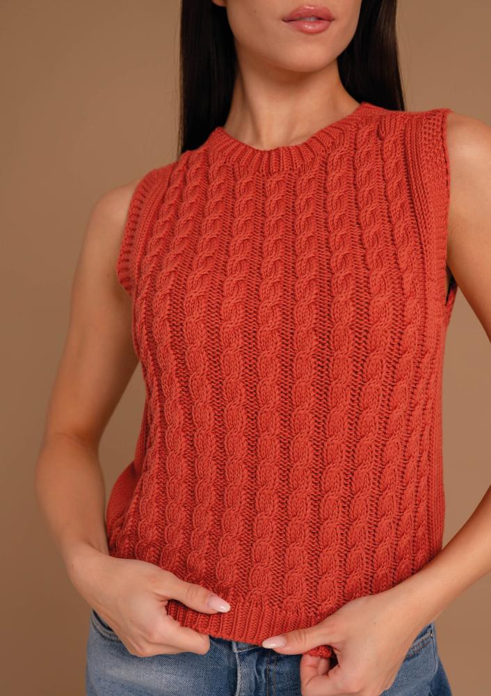 Terakotta színű, elasztikus kötött Magenta mellény, vastagabb kötésű, kerek nyakkivágással, ujjatlan. Oldalán rávarrt textil Magenta márkajelzés.
