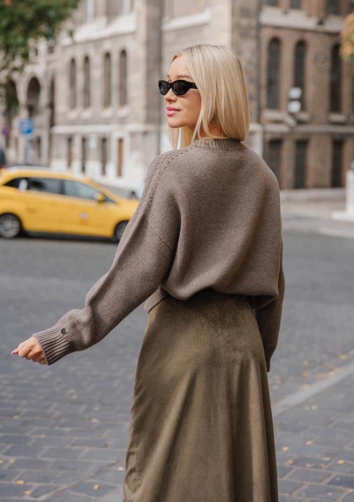 Fangó színű, Magenta kötött pulóver, kerek nyakkivágással. Ujján rávarrt textil Magenta márkajelzés.