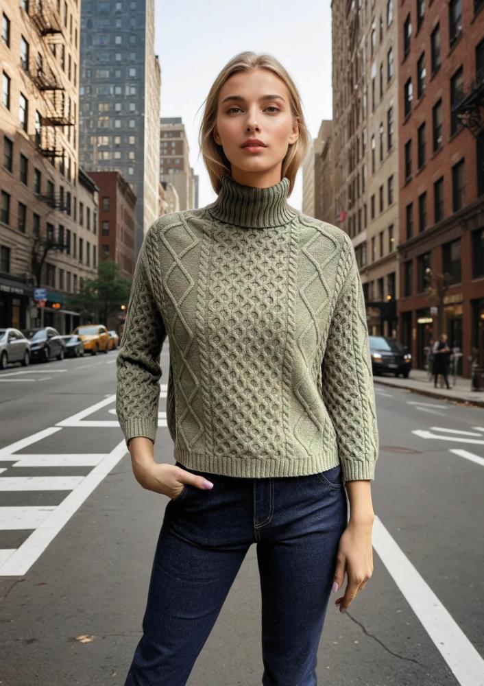 Zöld színű, kötött Magenta pulóver, garbó nyakkal, laza fazonú. Oldalán rávarrt textil Magenta márkajelzés.