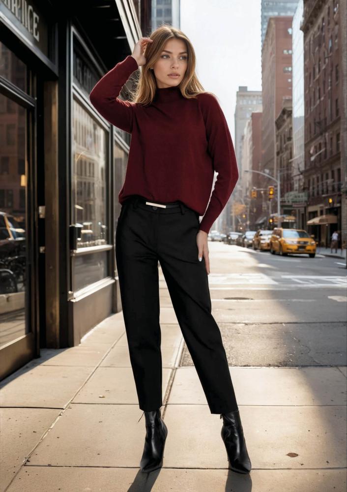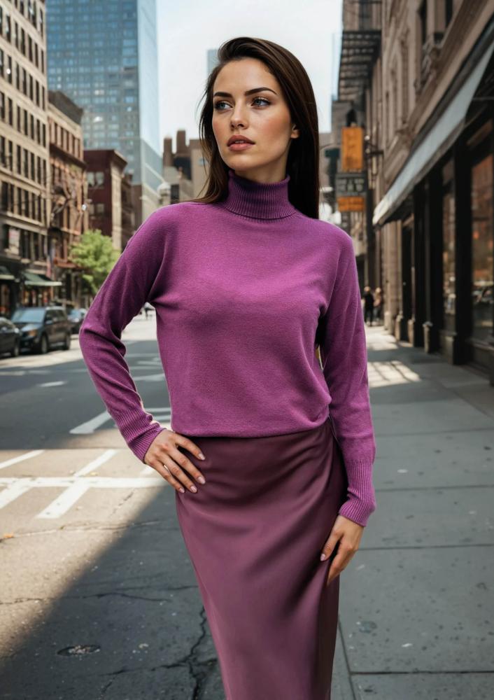 Lila színű, elasztikus kötött Magenta pulóver, garbós nyakrésszel, hosszú ujjal. Oldalán rávarrt textil Magenta márkajelzés.