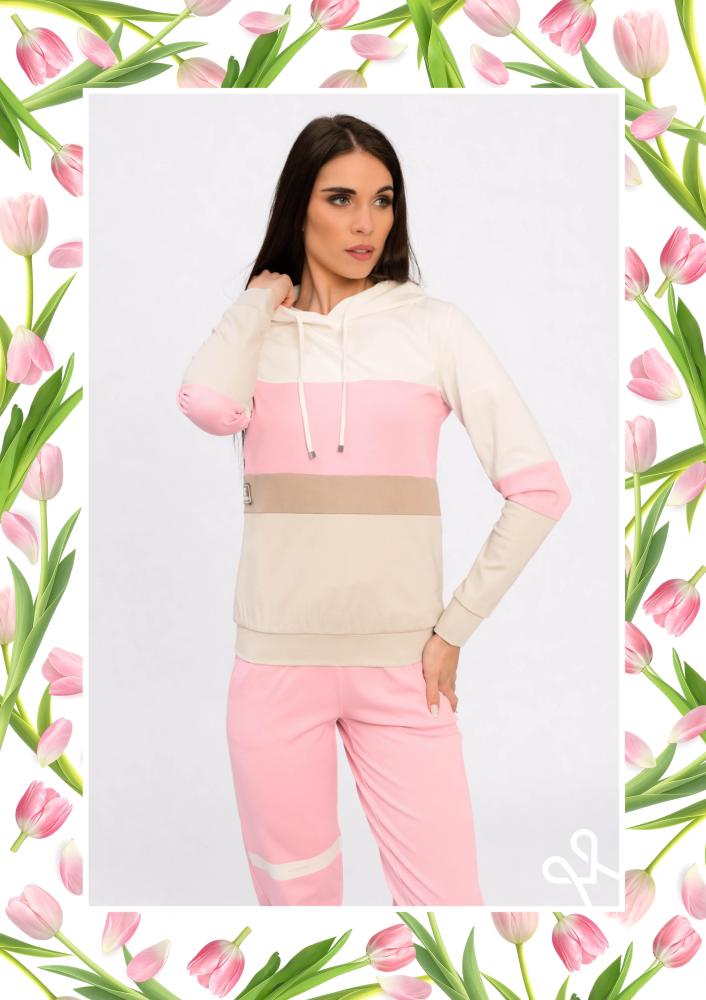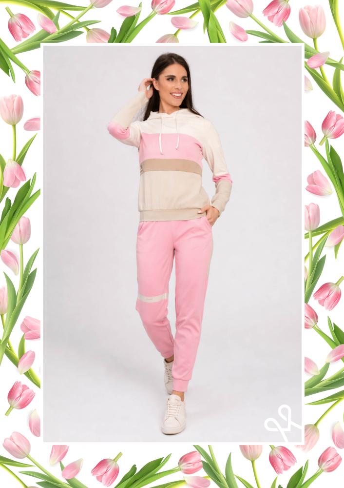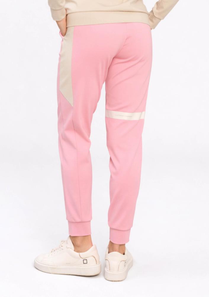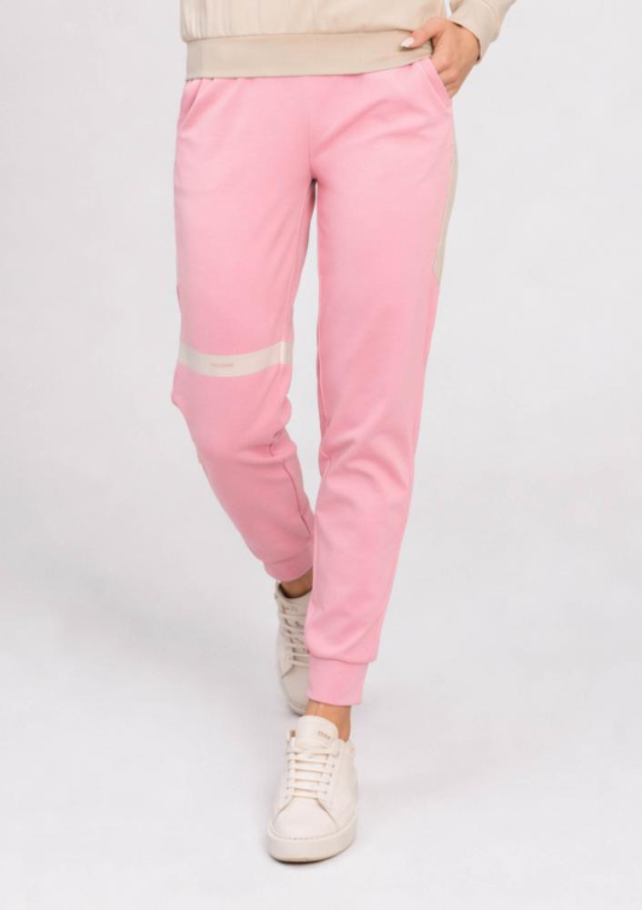 Rózsaszín színű, elasztikus punto Magenta melegítő nadrág, sportos, gumis derékrésszel és megkötővel, oldalán zsebekkel. Elején filmnyomott Magenta márkajelzés.