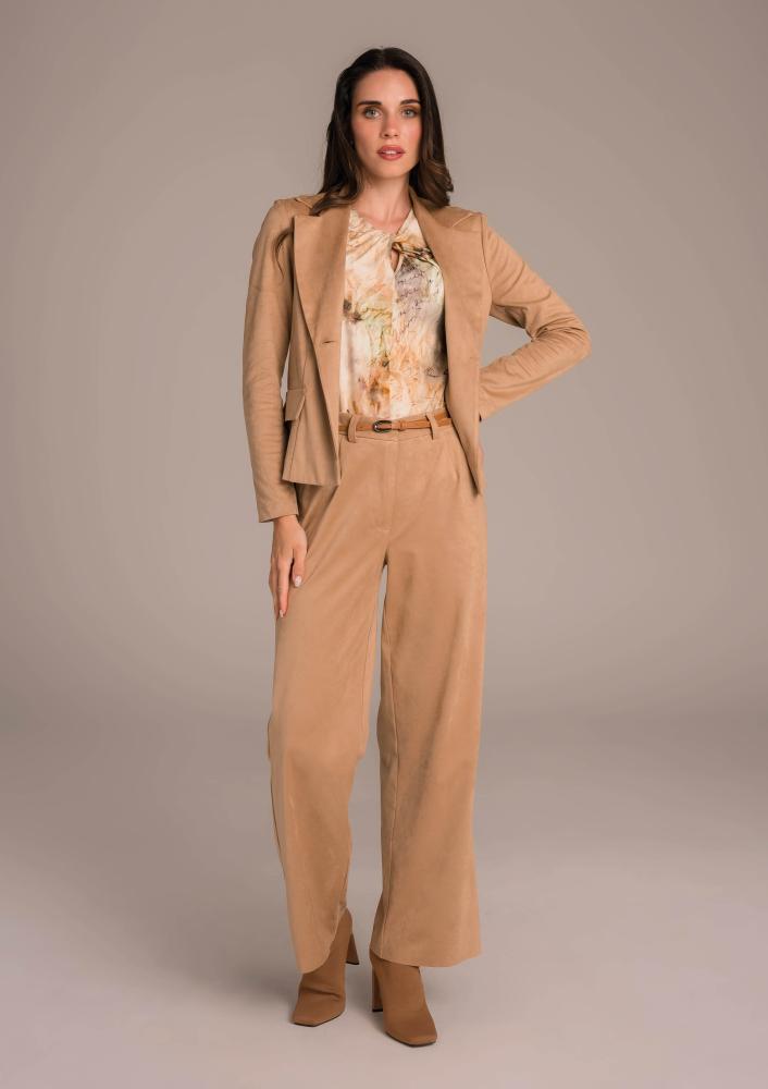Barna színű, elasztikus pamut-vászon Magenta nadrág, hátán zsebekkel, elején gombos és zippzáras záródással, övbújtatós derékrésszel. Oldalán rávarrt textil Magenta márkajelzés.
