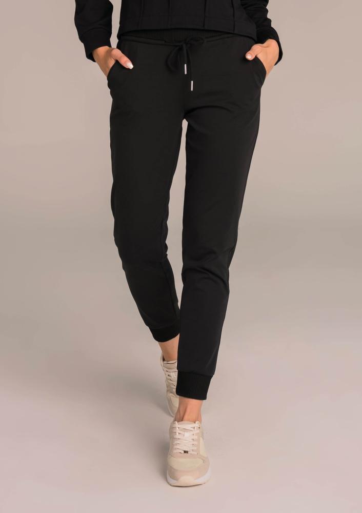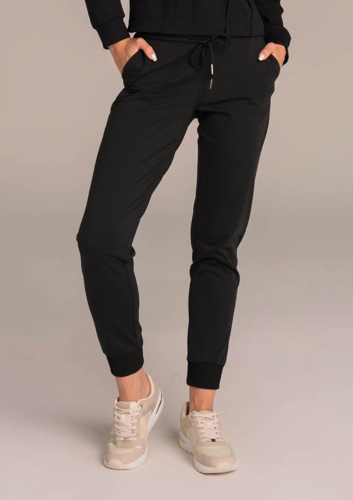 Fekete színű, sportos Magenta nadrág, szűkülő szárú, derékrészen széles passzéval és megkötővel, oldalán zsebekkel.