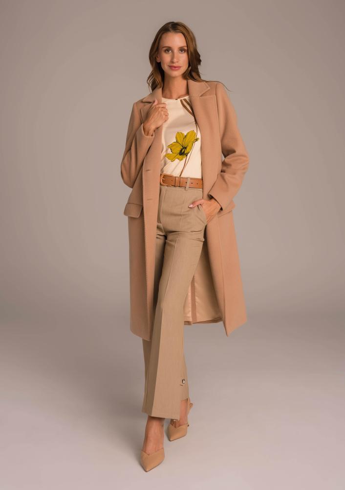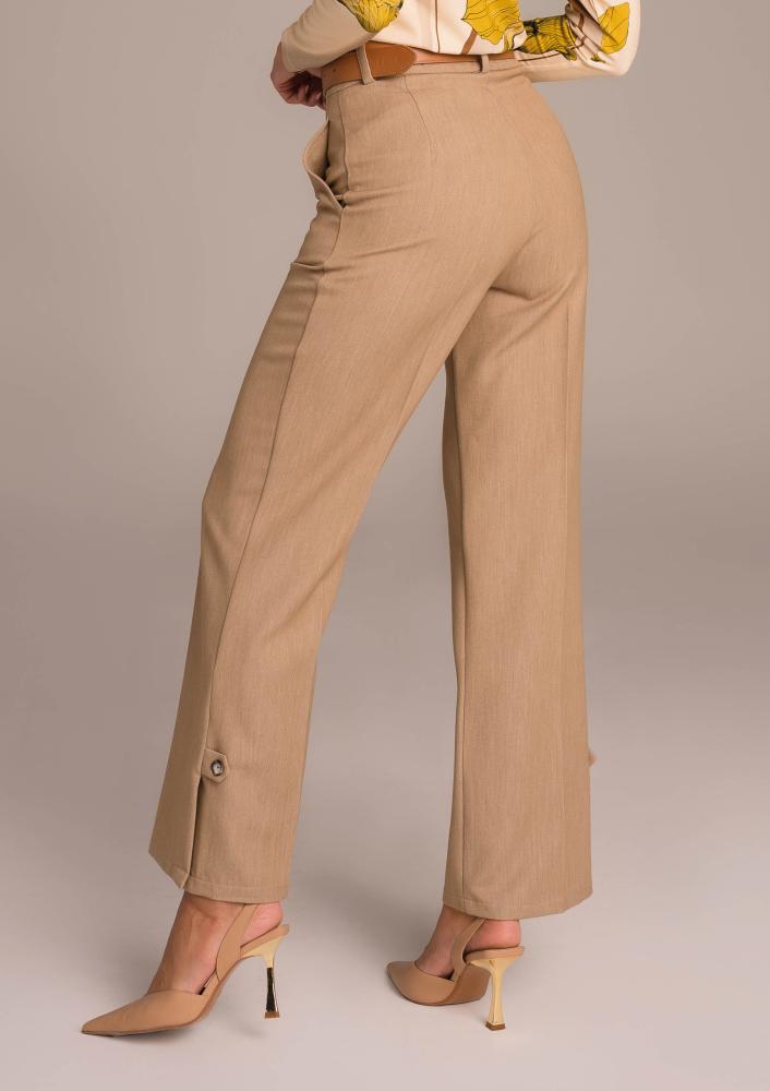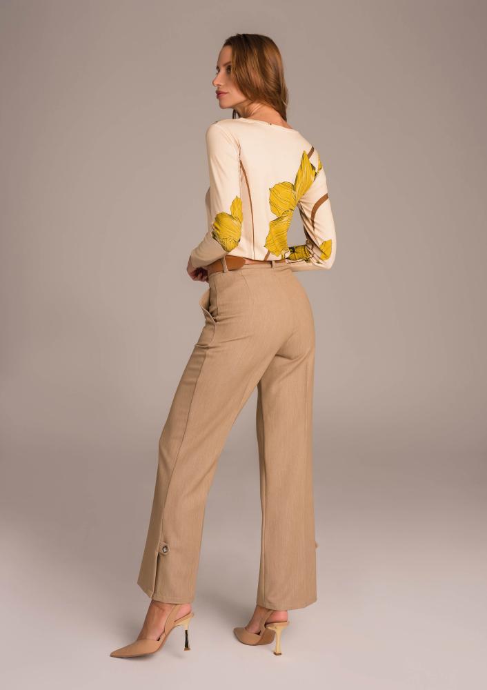Barna színű, szövet Magenta nadrág, egyenes szárú, élvasalással, elején gombos és zippzáras záródással, övbújtatós derékrésszel, zsebekkel. Oldalán rávarrt textil Magenta márkajelzés.