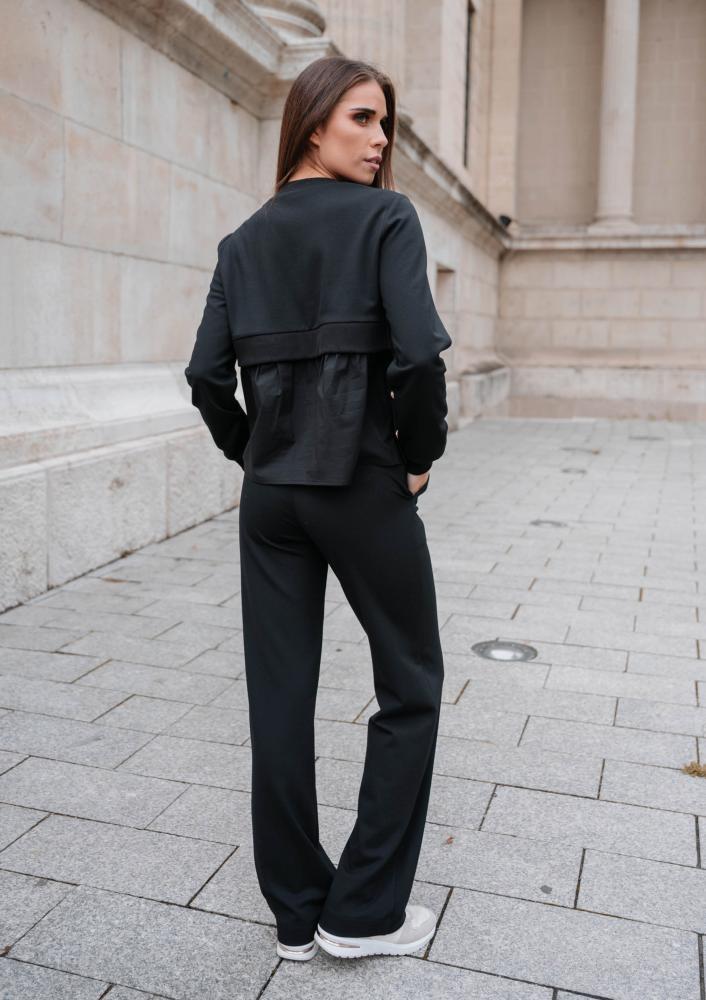 Fekete színű, Magenta melegítő nadrág, egyenes szárú, oldalán zsebekkel, gumis derékrésszel. Oldalán rávarrt textil Magenta márkajelzés.