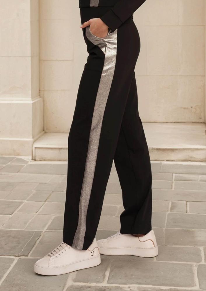 Fekete színű, elasztikus Magenta melegítő nadrág, bővebb szárú, gumis derékrésszel, oldalán zsebekkel.