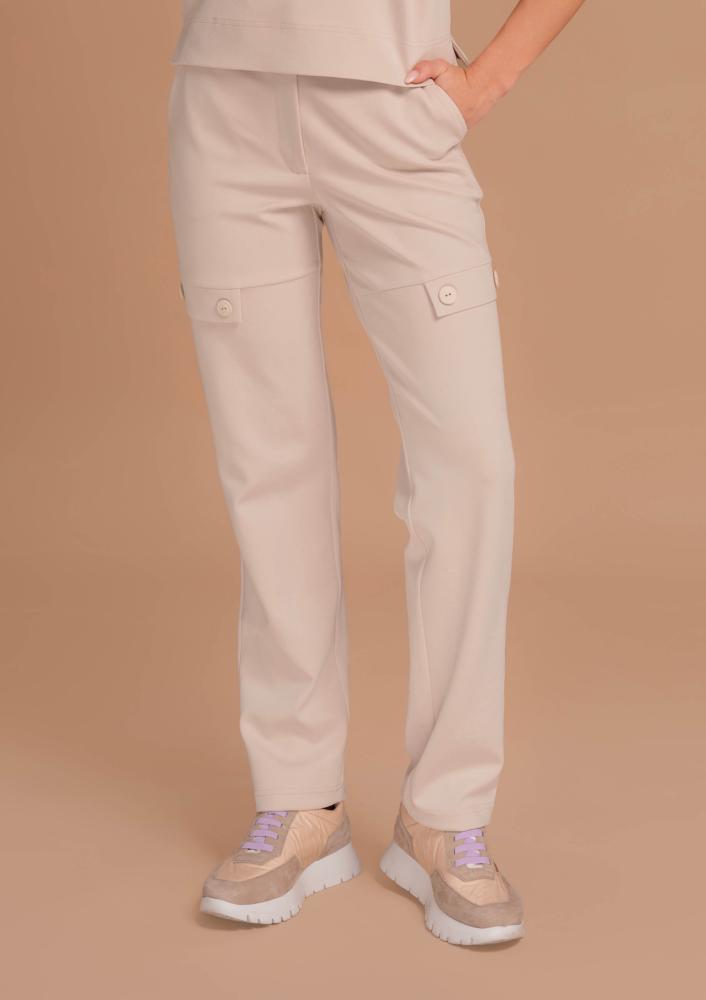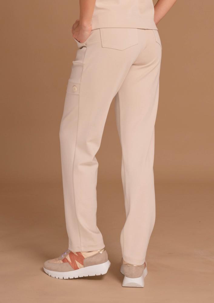 Vaj színű, Magenta nadrág, szűkebb szárú, oldalán zsebfedős részletekkel, elején gombos és zippzáras záródással, övbújtatós derékrésszel.
