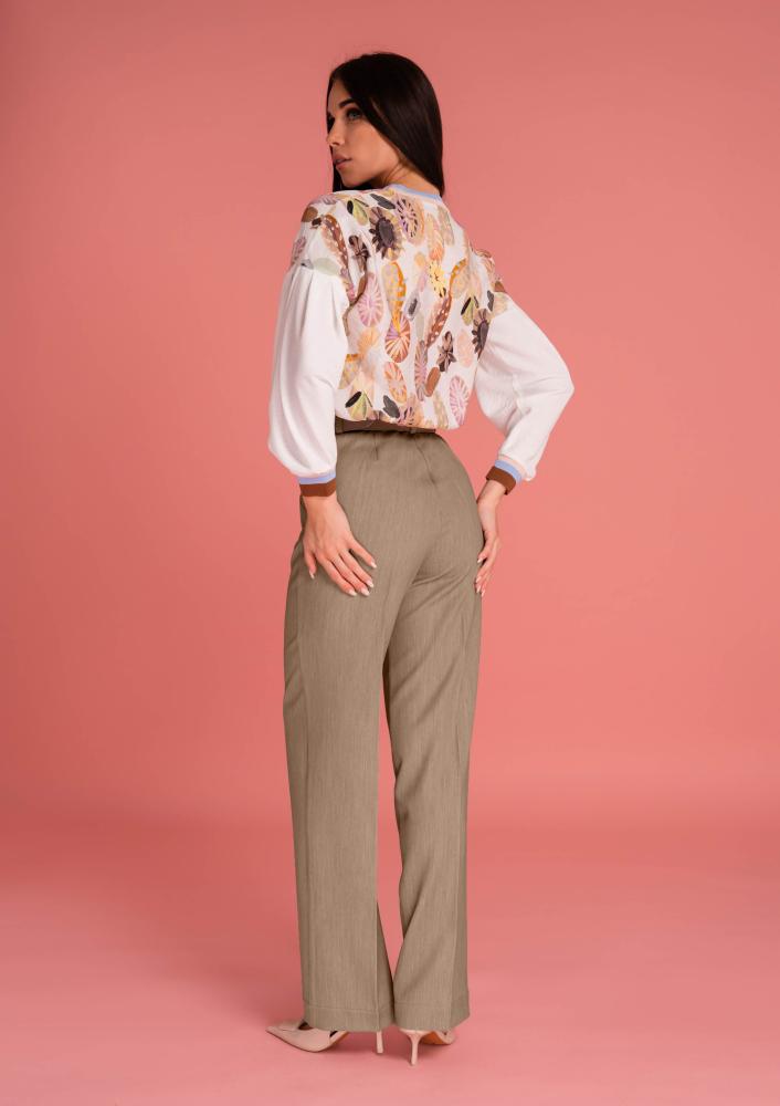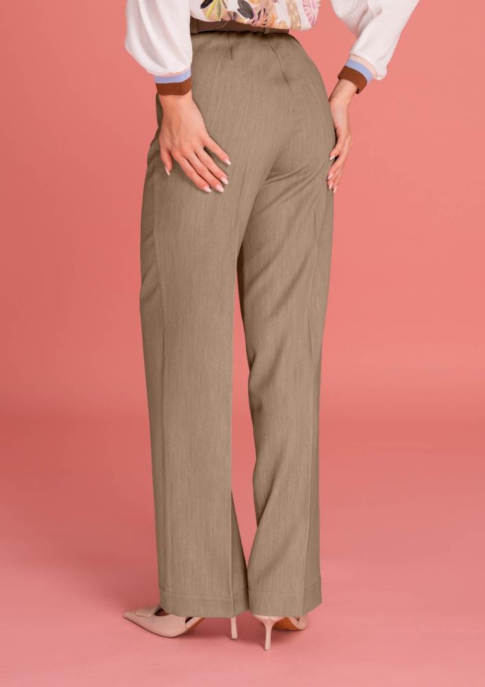 Bézs színű, Magenta szövetnadrág, bővebb szárral, élvasalással, elején gombos és zippzáras záródással, övbújtatós derékrésszel, zsebekkel. Hátul rávarrt fém Magenta márkajelzés.