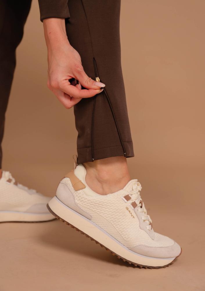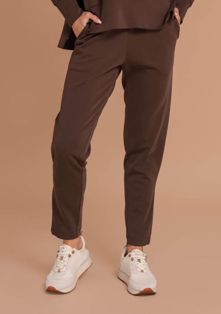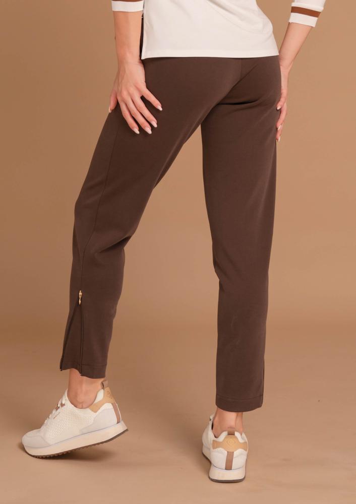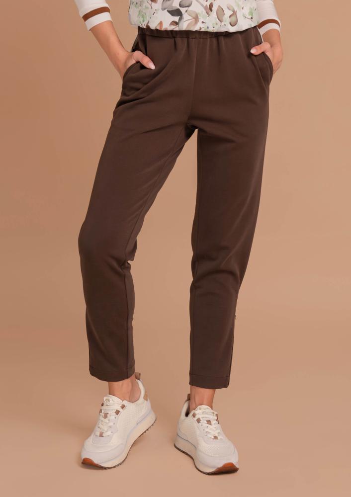 Barna színű, elasztikus Magenta nadrág, szűkülő szárral, gumis derékrésszel, oldalán zsebekkel. Elején filmnyomott Magenta márkajelzés.