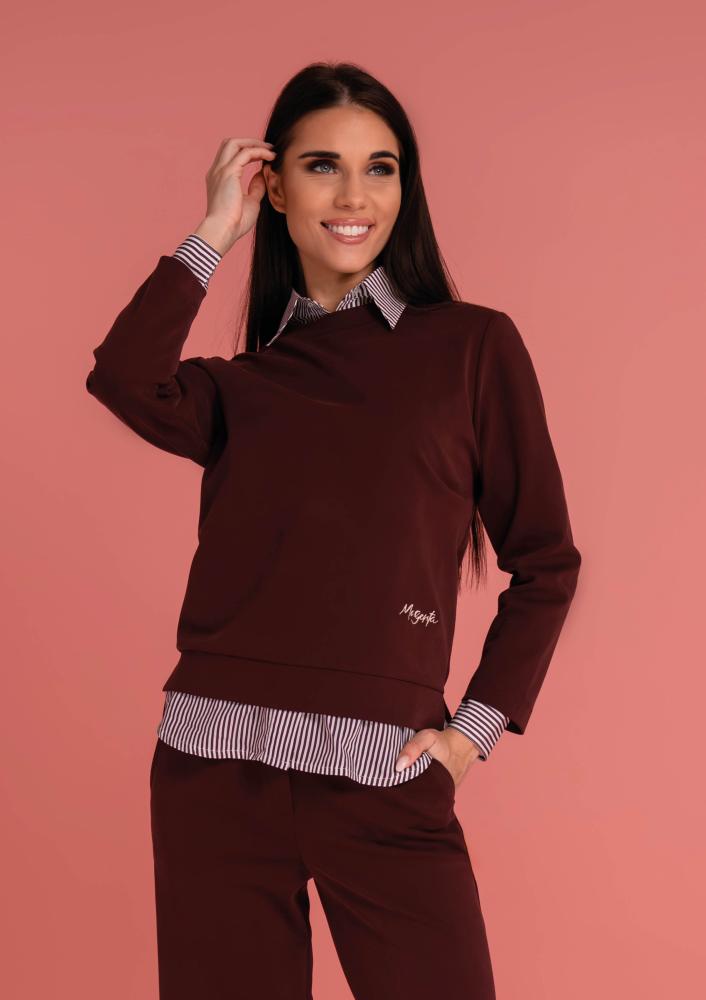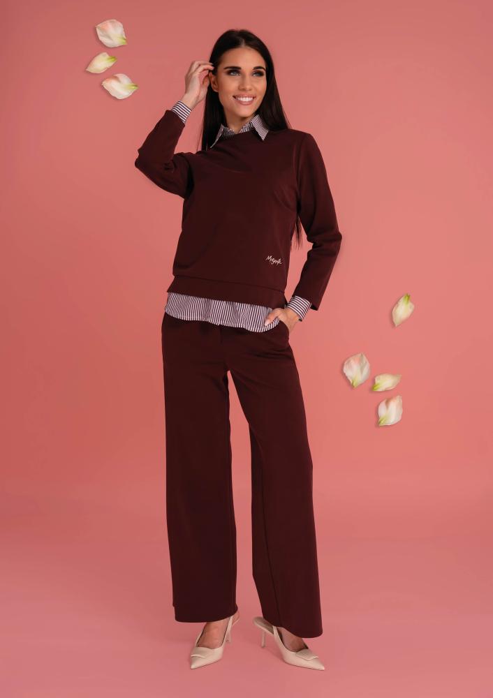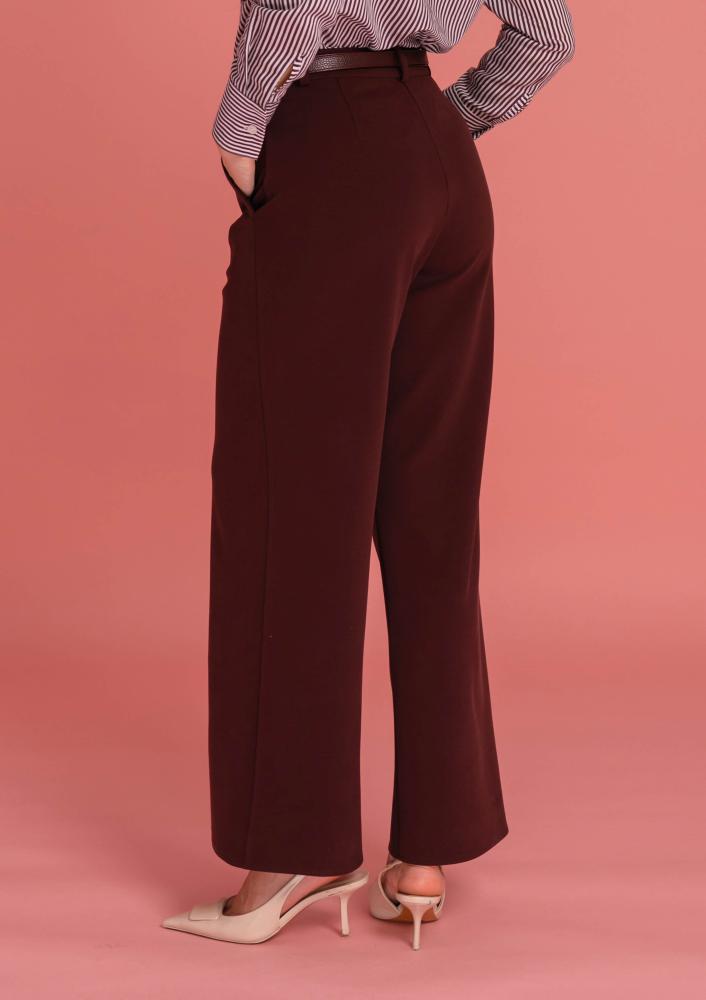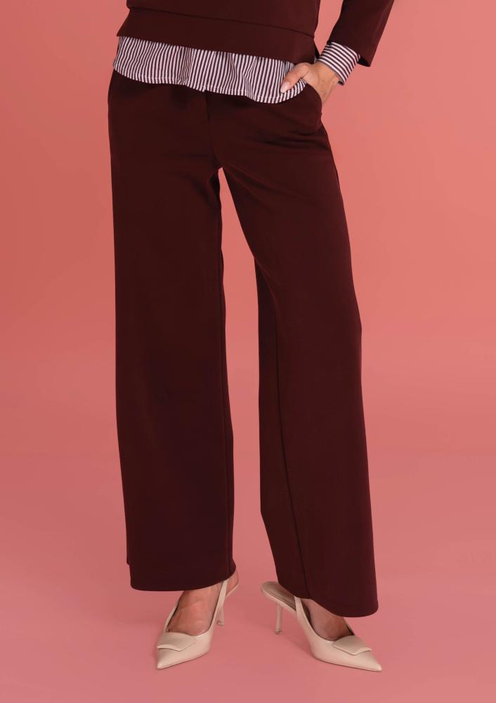 Bordó színű, elasztikus Magenta nadrág, bővebb szárú, elején gombos és zippzáras záródással, övbújtatós derékrésszel, zsebekkel.