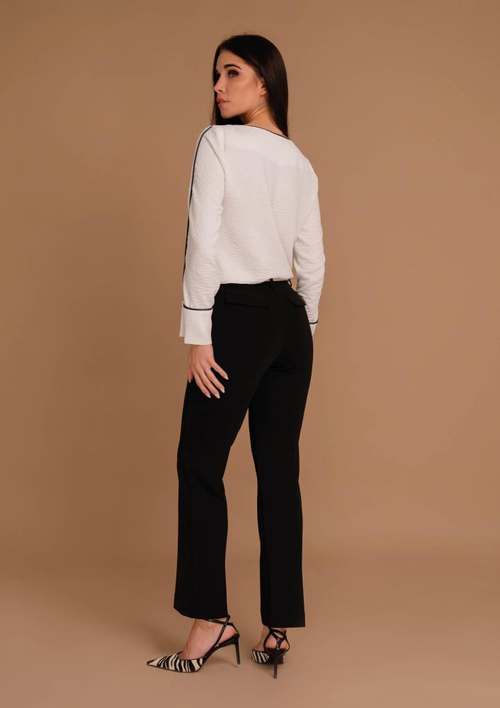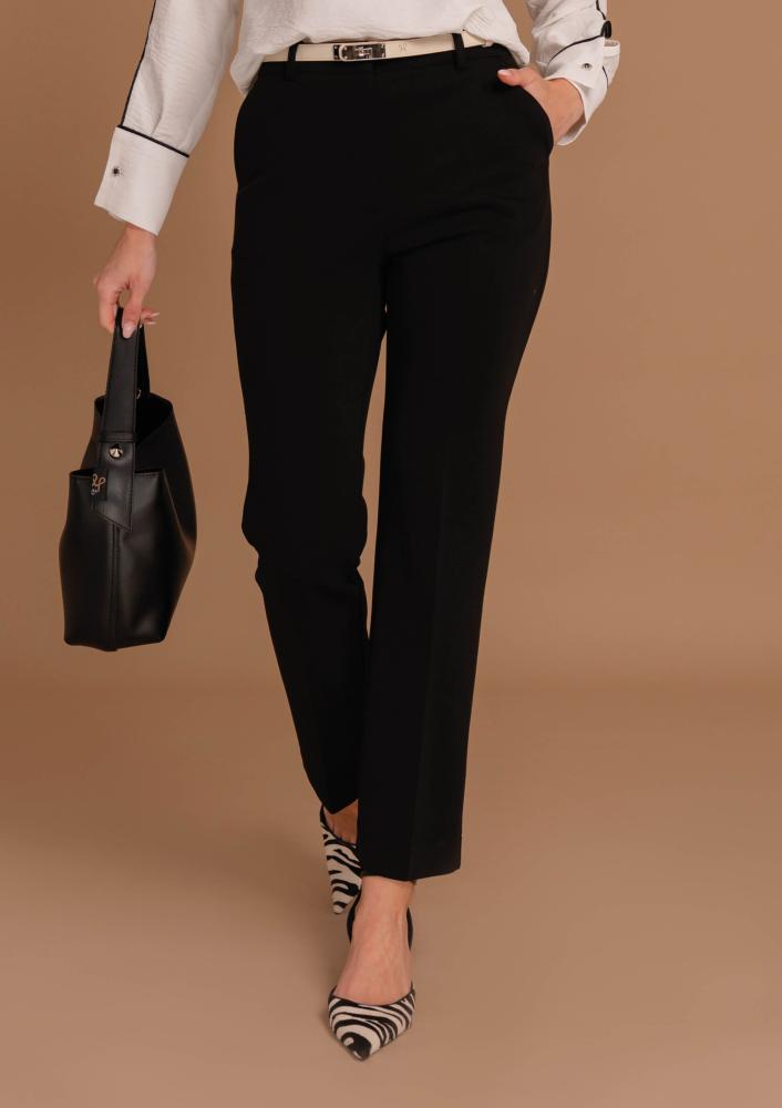 Fekete színű, Magenta nadrág, egyenes szárú, elején gombos és zippzáras záródással, övbújtatós derékrésszel, oldalán zsebekkel. Oldalán rávarrt textil Magenta márkajelzés.