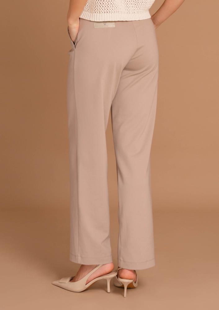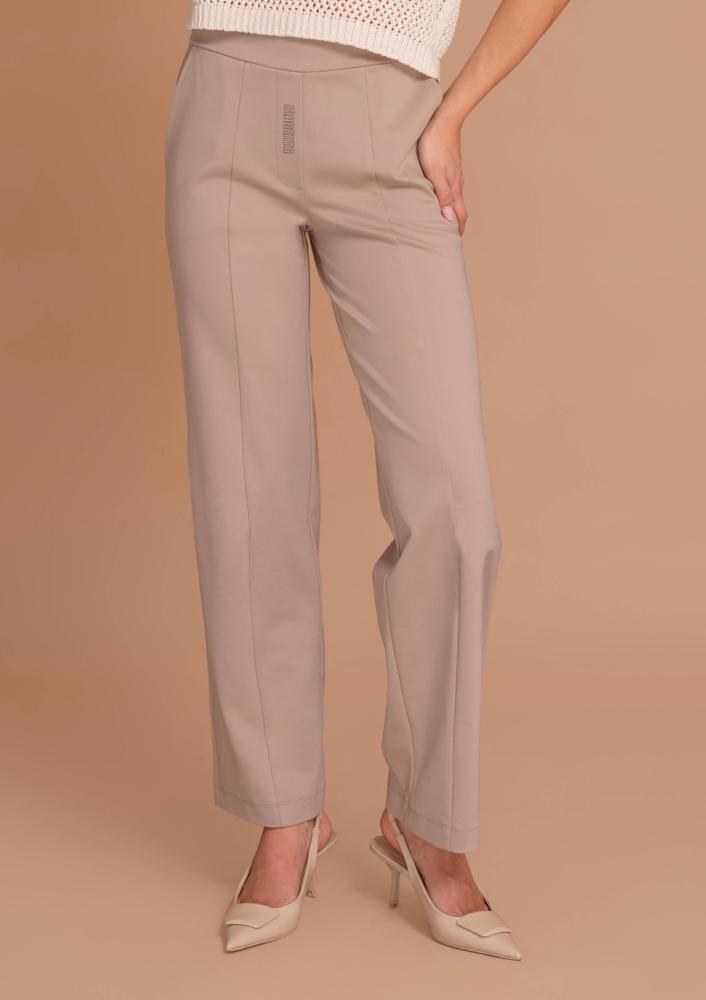 Bézs színű, elasztikus punto Magenta nadrág, gumis derékrésszel, zsebekkel, egyenes szárú. Oldalán rávarrt textil Magenta márkajelzés.