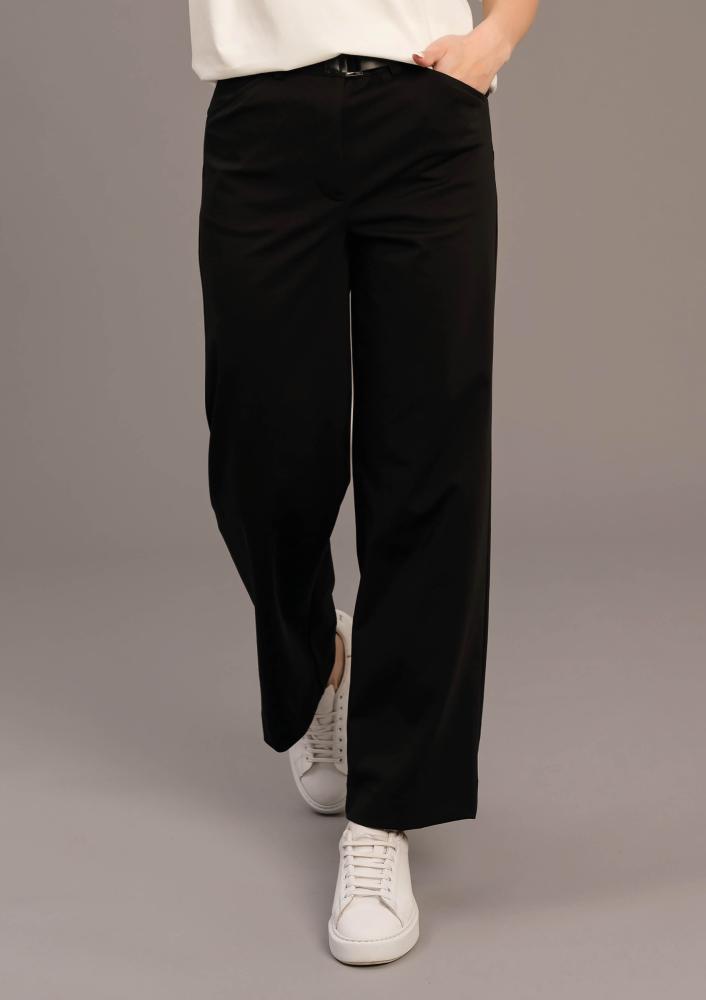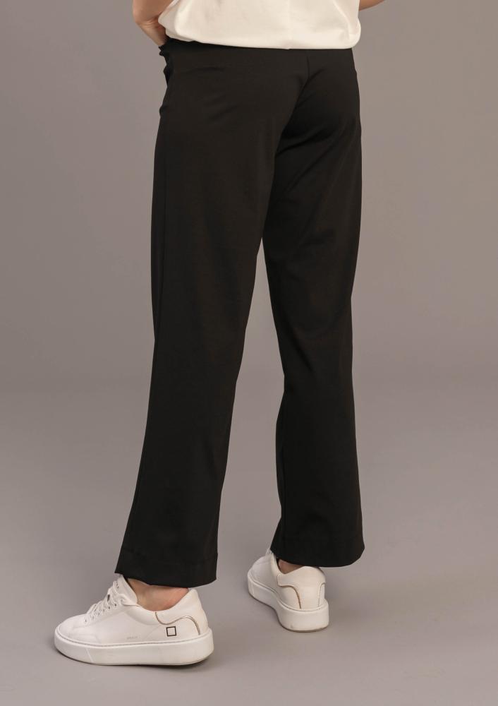 Fekete színű, elasztikus Magenta nadrág, egyenes fazonú, elején zippzáras és kapcsos záródással, zsebekkel. Oldalán rávarrt textil Magenta márkajelzés.