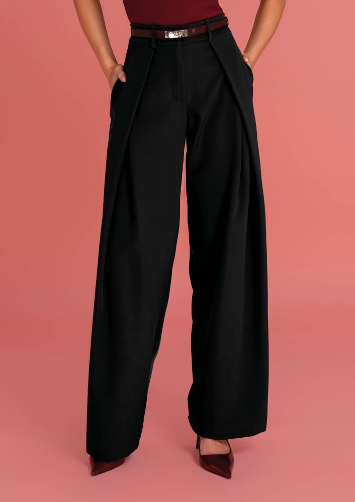 Fekete színű, Magenta nadrág, bő fazonú, elején hajtással, elején gombos és zippzáras záródással, övbújtatós derékrésszel, zsebekkel.