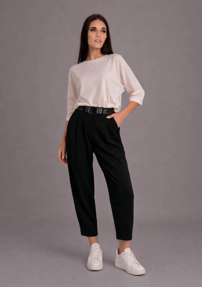 Fekete színű, Magenta nadrág, laza fazonú, elején hajtásokkal, elején gombos és zippzáras záródással, övbújtatós derékrésszel, zsebekkel.