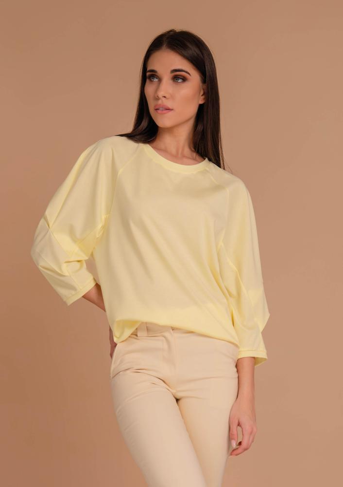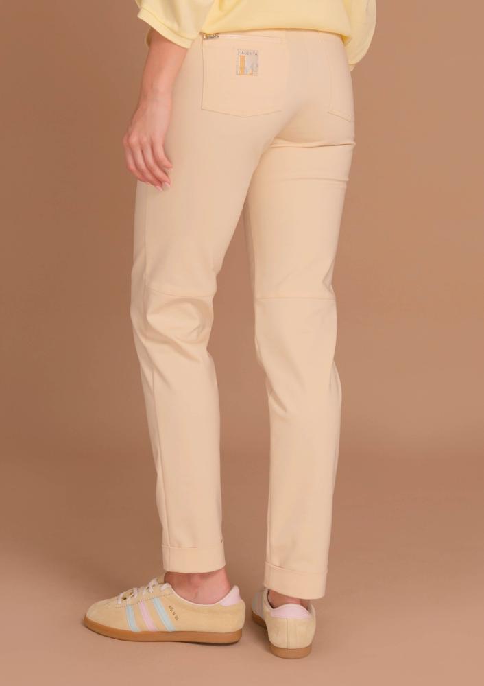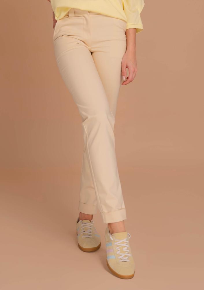 Vaj színű, pamut-vászon Magenta nadrág, szűkülő szárral, elején gombos és zippzáras záródással, övbújtatós derékrésszel, zsebekkel. Hátul rávarrt Magenta márkajelzés.