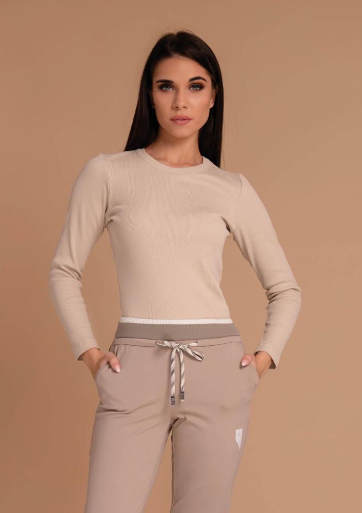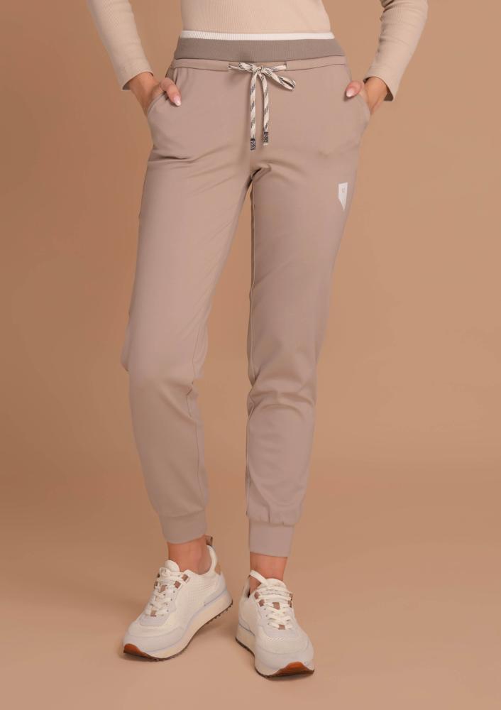 Bézs színű, punto Magenta nadrág, gumis derékrésszel, megkötővel, oldalán zsebekkel, alja passzéval.