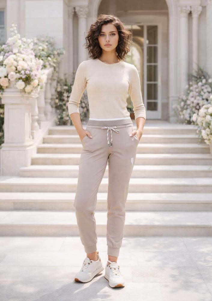 Bézs színű, punto Magenta nadrág, gumis derékrésszel, megkötővel, oldalán zsebekkel, alja passzéval. Elején filmnyomott Magenta márkajelzés.