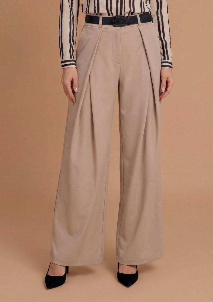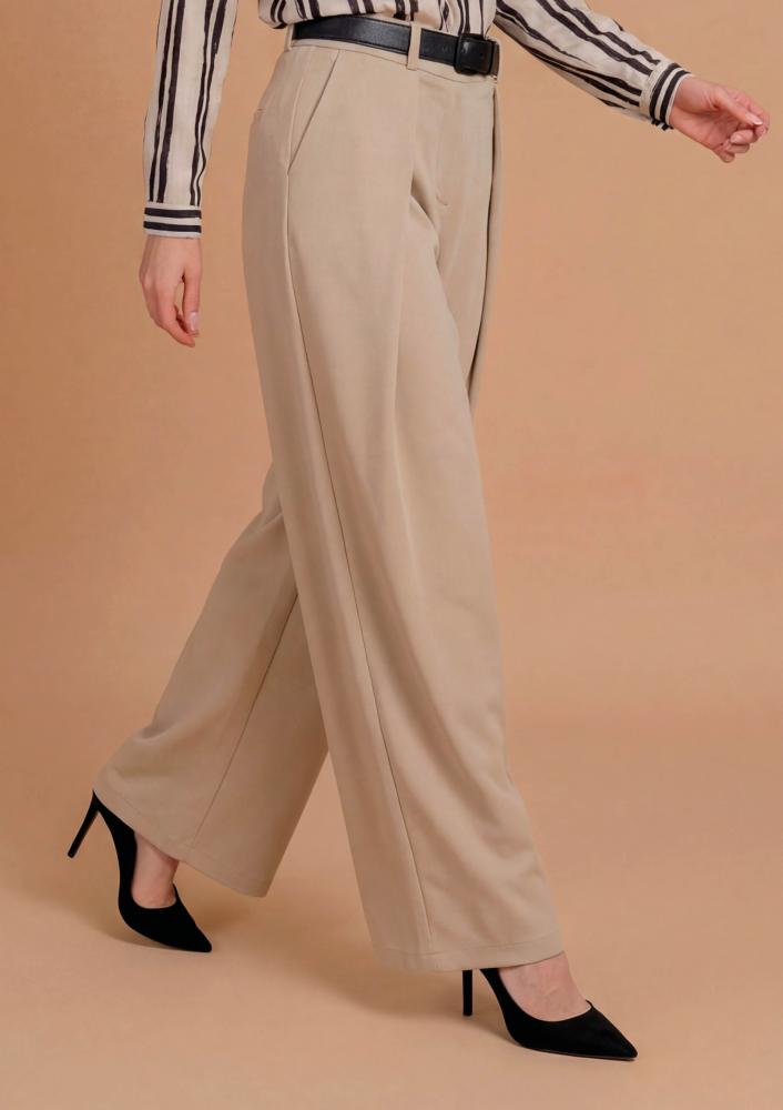 Bézs színű, Magenta nadrág, bő fazonú, elején hajtással, elején gombos és zippzáras záródással, övbújtatós derékrésszel, zsebekkel.