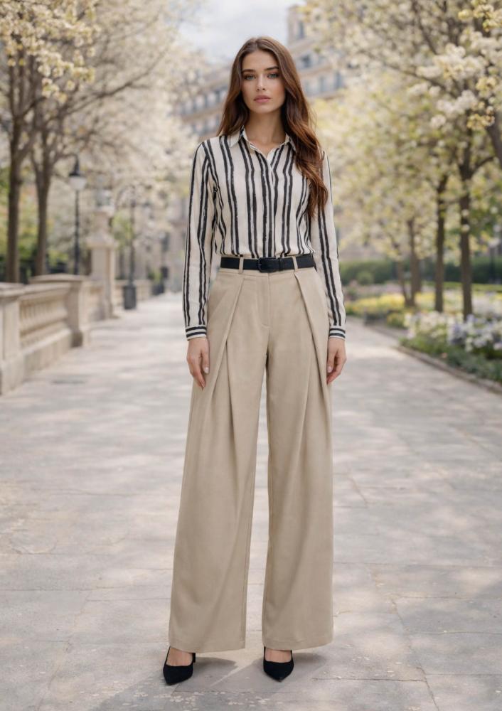 Bézs színű, Magenta nadrág, bő fazonú, elején hajtással, elején gombos és zippzáras záródással, övbújtatós derékrésszel, zsebekkel. Hátul rávarrt fém Magenta márkajelzés.