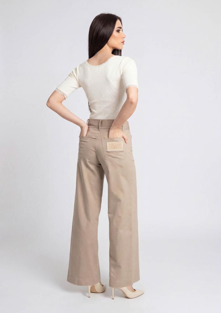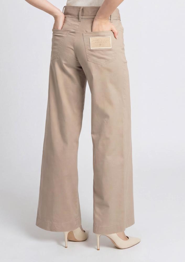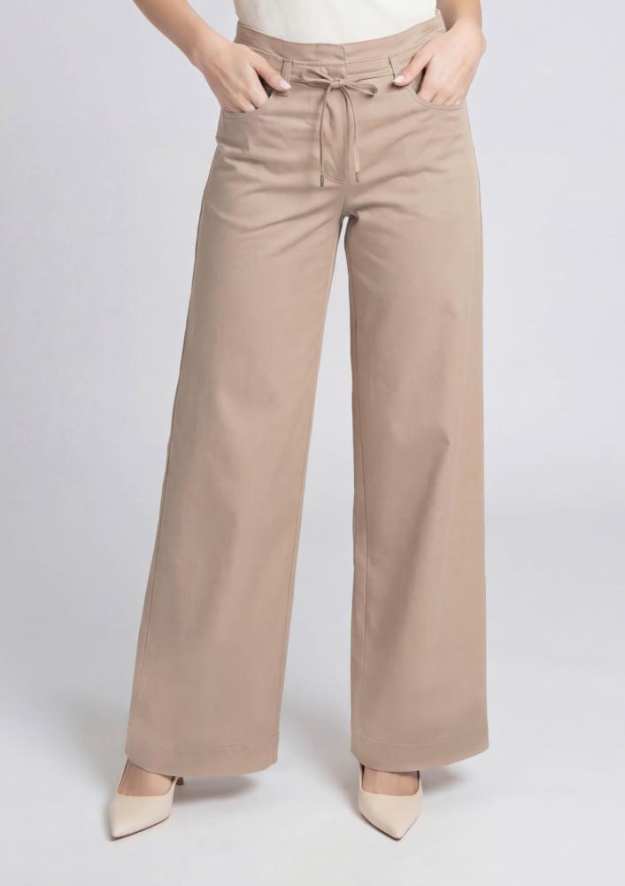 Bézs színű, vászon Magenta nadrág, bővebb szárú, elején gombos és pattentos záródással, derékrészen megkötővel, zsebekkel. Hátul rávarrt Magenta márkajelzés.