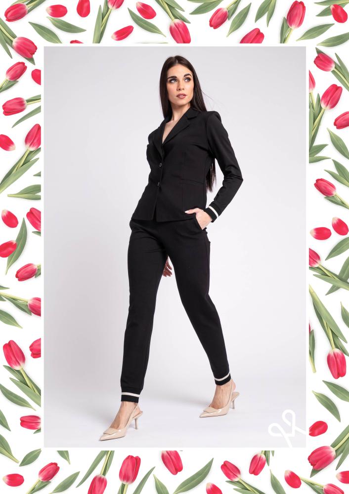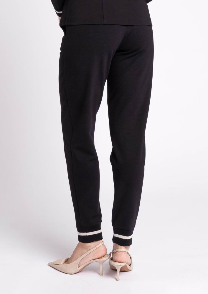 Fekete színű, elasztikus punto Magenta nadrág, szűk szárú, gumis derékrésszel és megkötővel, oldalán zsebekkel, alján passzéval díszítve.