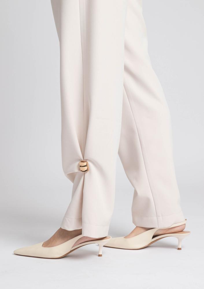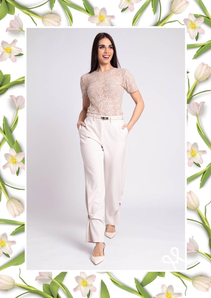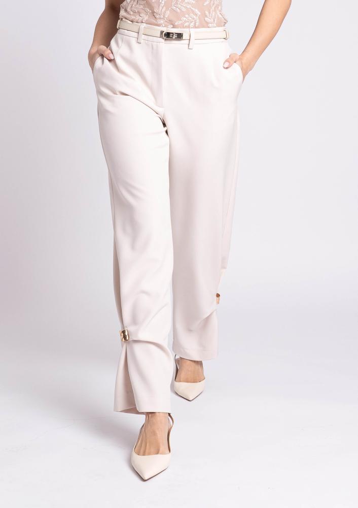 Vaj színű, kevert szálas Magenta nadrág, egyenes szárú, elején kapcsos és zippzáras záródással, övbújtatós derékrésszel, zsebekkel, alján csavarással és arany díszítéssel.