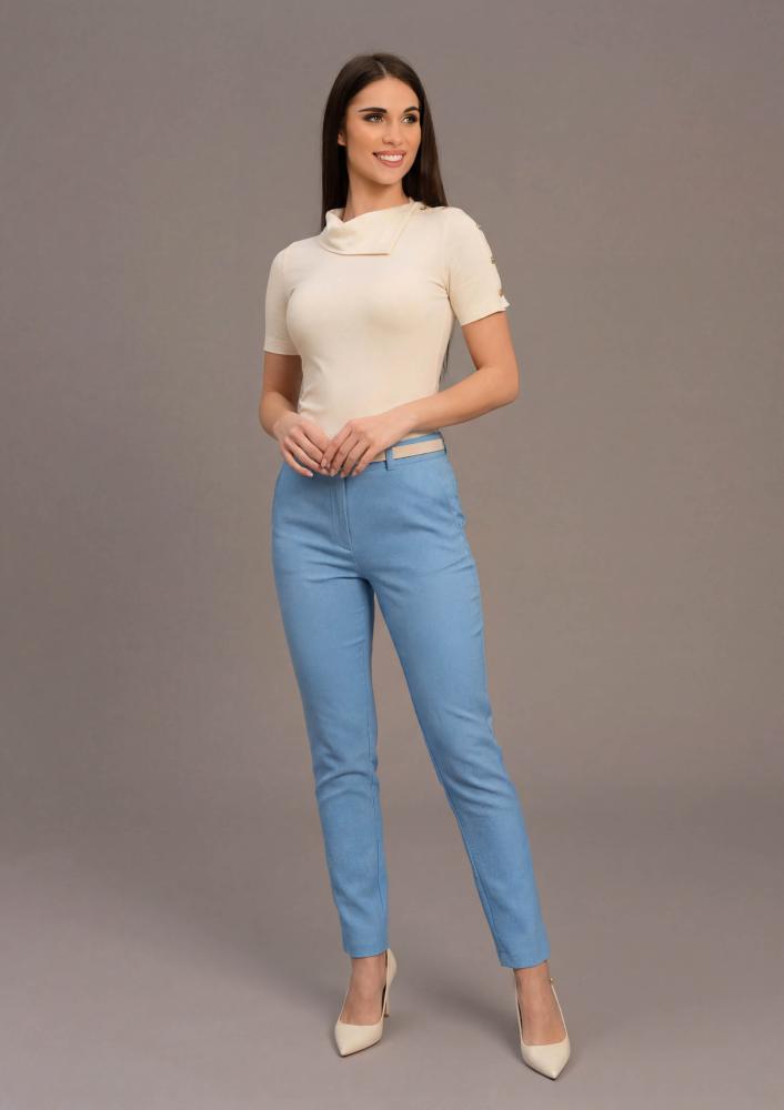 Kék színű, vászon Magenta nadrág, elején gombos és zippzáras záródással, övbújtatós derékrésszel, zsebekkel. Hátul rávarrt Magenta márkajelzés.