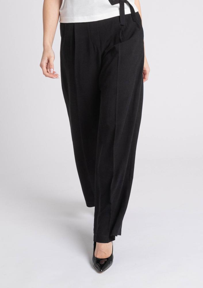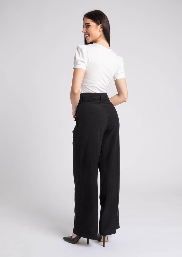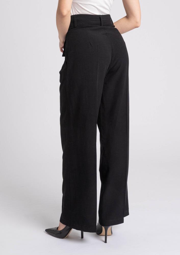 Fekete színű, vászon Magenta nadrág, egyenes szárú, élvasalt, elején kapcsos és zippzáras záródással, derekán megkötővel, zsebekkel. Oldalán rávarrt textil Magenta márkejelzés.