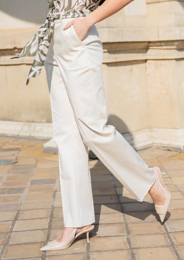 Vaj színű, vászon hatású Magenta nadrág, egyenes szárú, élvasalt, elején kapcsos és zippzáras záródással, övbújtatós derékrésszel, oldalán zsebekkel.