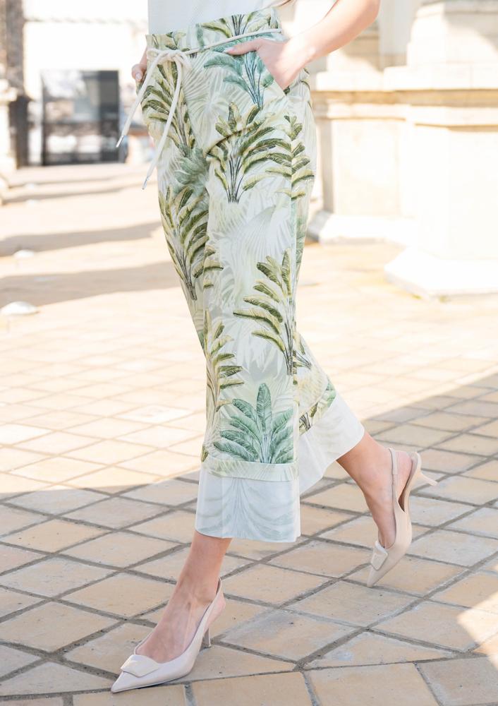 Mintás, vászon Magenta nadrág, egyenes szárú, élvasalt, derekán megkötővel, elején kapcsos és zippzáras záródással, oldalán zsebekkel, alján széles felhajtással.