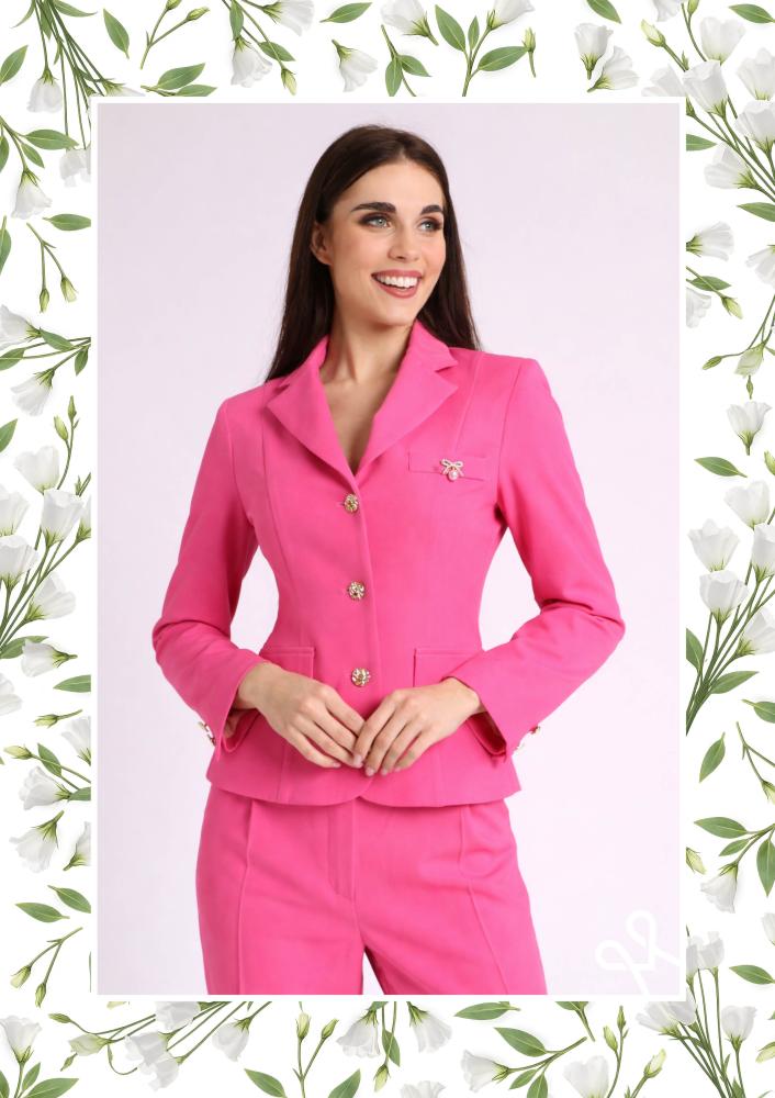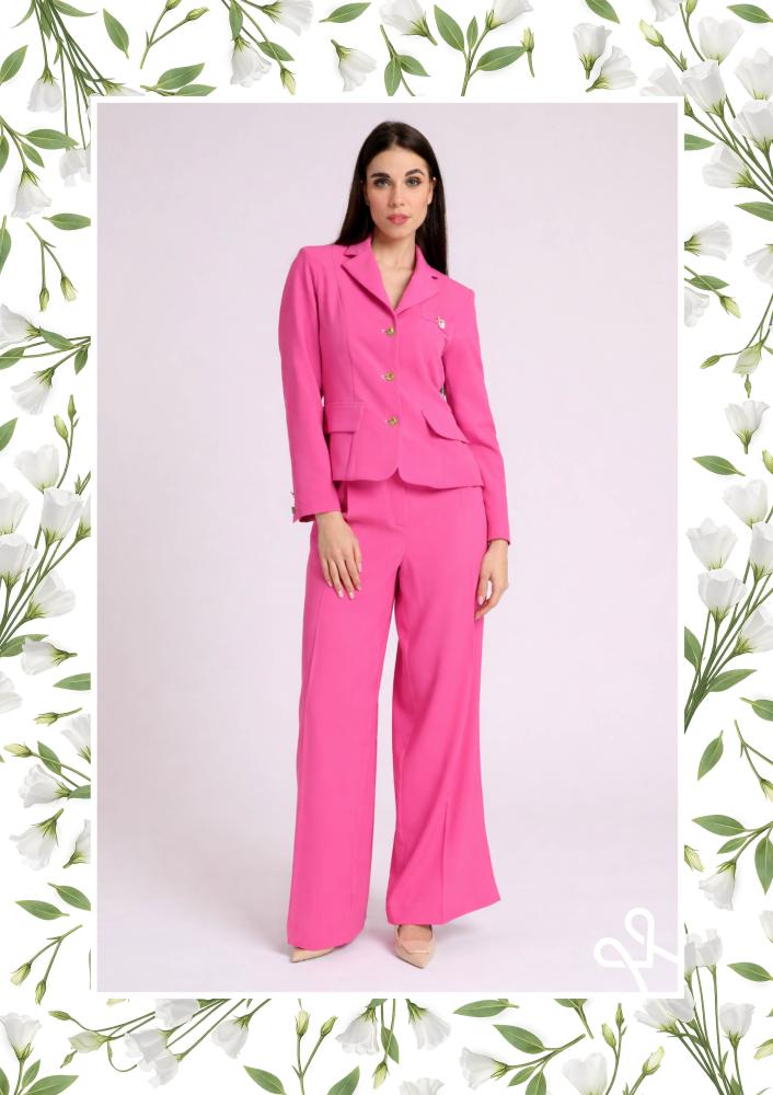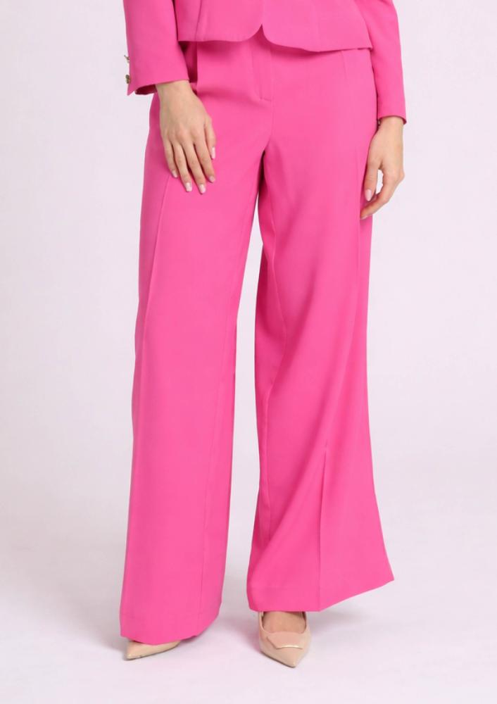 Pink színű, kevert szálas Magenta nadrág, élvasalással, egyenes szárú, elején kapcsos és zippzáras záródással, övbújtatós derékrésszel, zsebekkel. Hátul rávarrt Magenta márkajelzés.