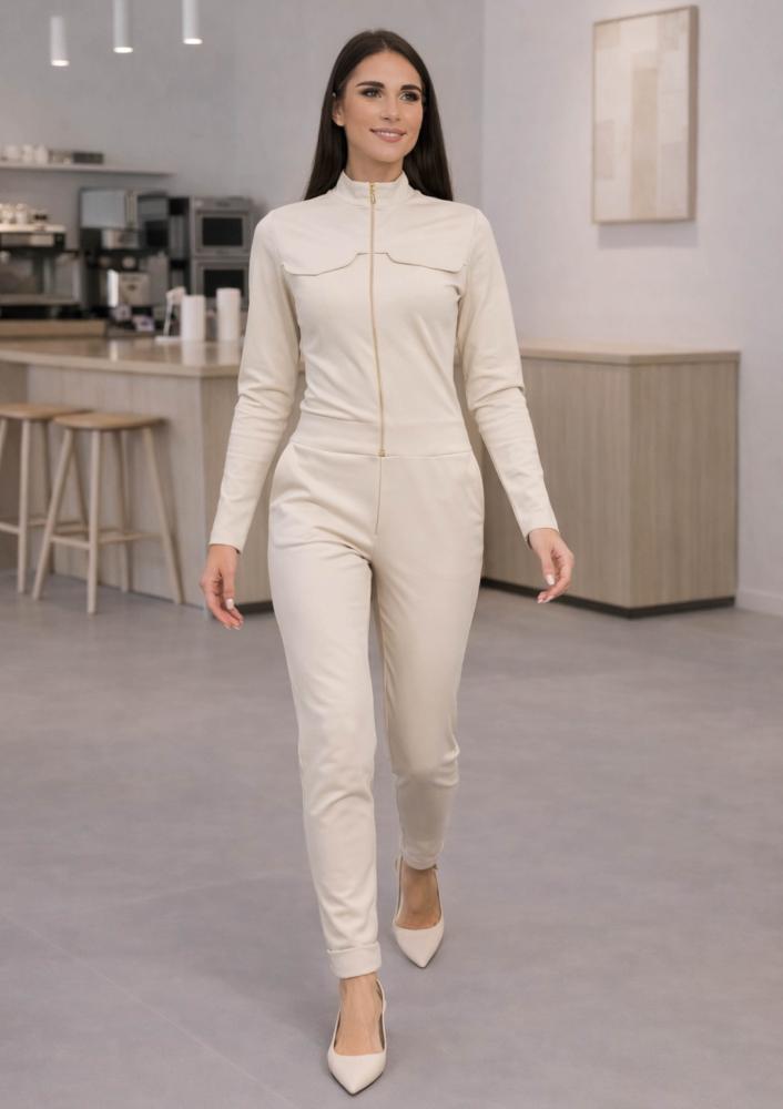 Bézs színű, Magenta overál, elején zippzáras záródással, derékrészen megkötővel, elől-hátul zsebekkel. Ujján filmnyomott Magenta márkajelzés.