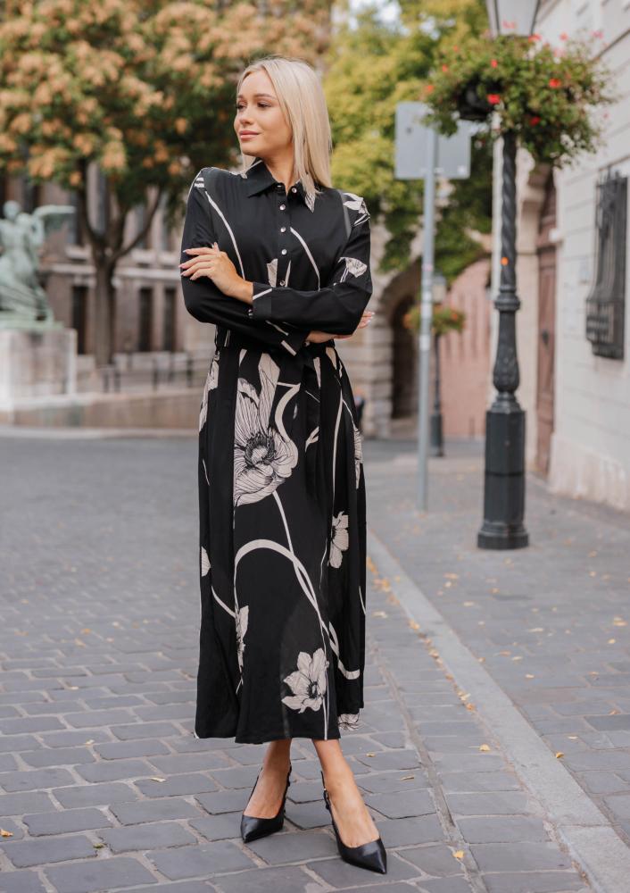 Mintás, enyhén elasztikus pamut Magenta ruha, bő fazonú, elején nagy zsebekkel díszítve. Elején filmnyomott Magenta márkajelzés.