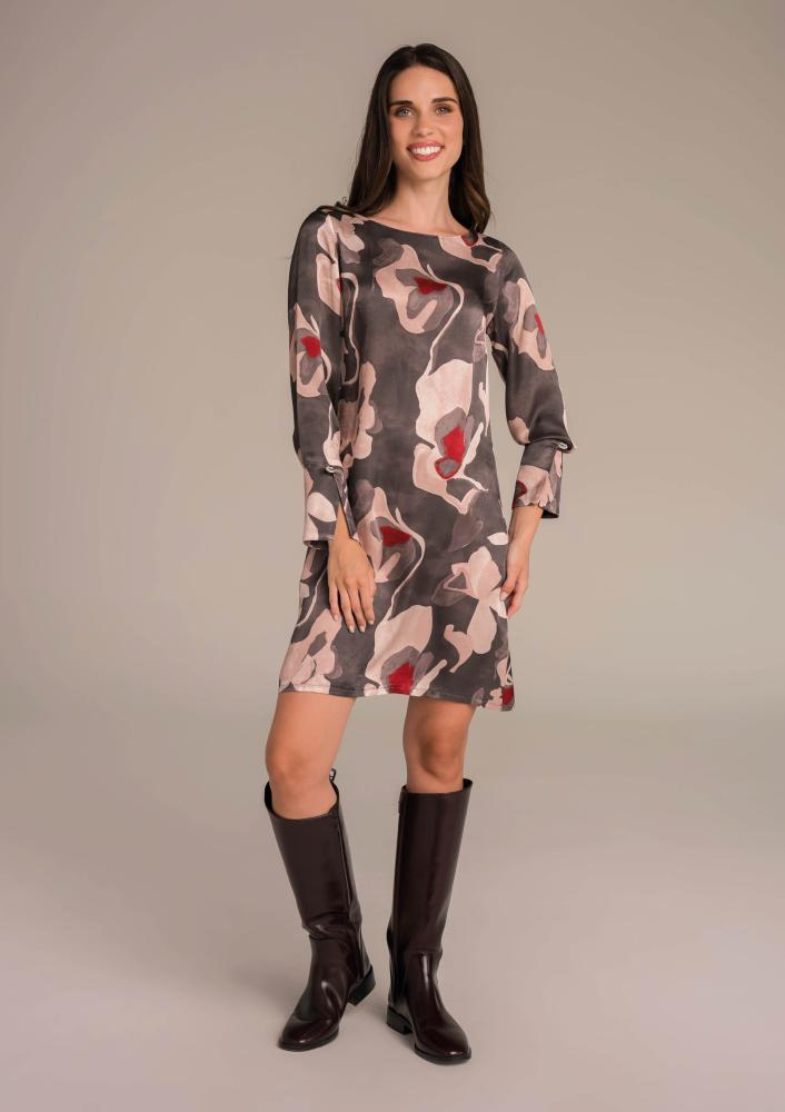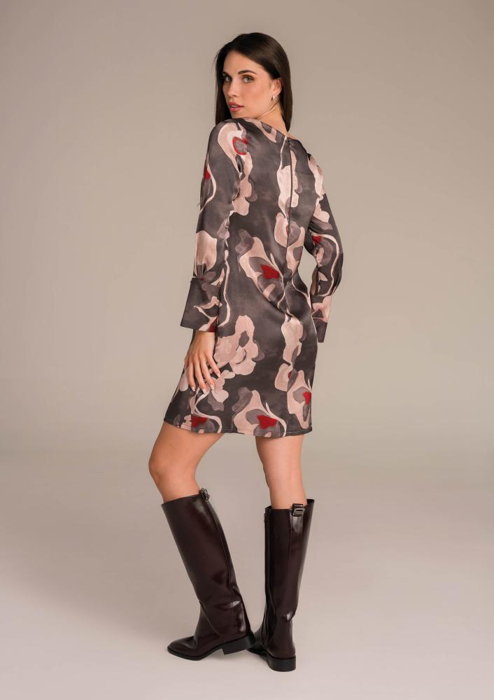 Mintás, szatén hatású Magenta ruha, laza fazonú, ujján széles mandzsettával, hátán gombos záródással, térd főlé érő hosszal. Oldalán rávarrt textil Magenta márkajelzés.