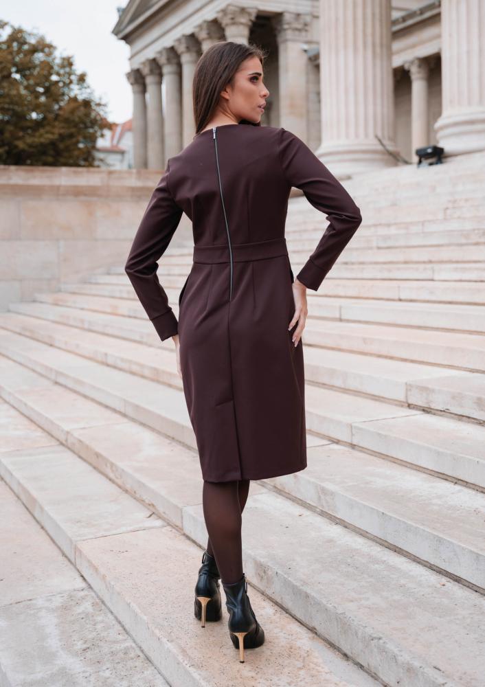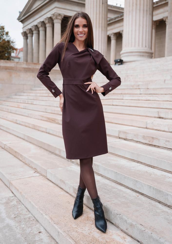 Barna színű, kevert szálas Magenta ruha, nyakrészen masnis és strasszköves díszítéssel, hátul zippzáras záródással, térd fölé érő hosszal. Oldalán rávarrt textil Magenta márkajelzés.