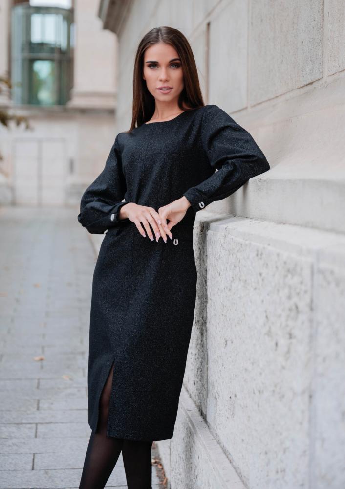 Fekete színű, punto Magenta ruha, szűkebb fazonú, elején zsebfedőkkel és straszkövekkel díszítve, hátul zippzáras záródással. Oldalán rávarrt textil Magenta márkajelzés.