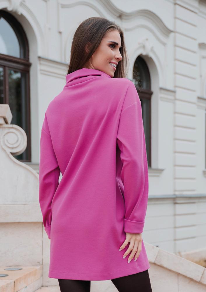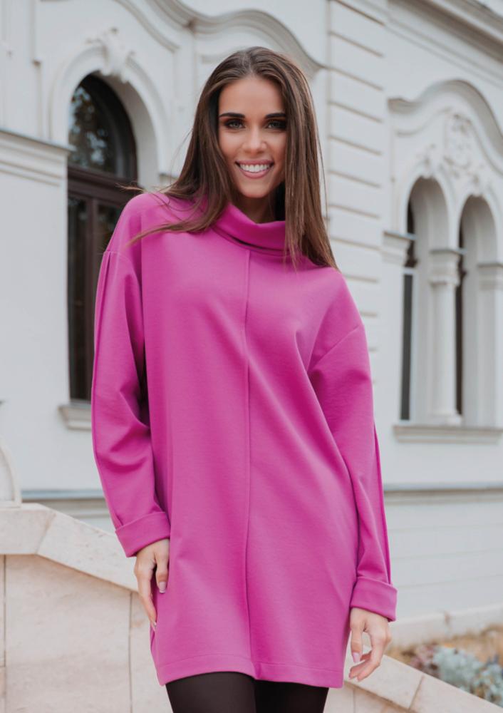 Rózsaszín színű, elasztikus punto Magenta ruha, bő fazonú, magas álló gallér résszel, térd főlé érő hosszal. Oldalán rávarrt textil Magenta márkajelzés.