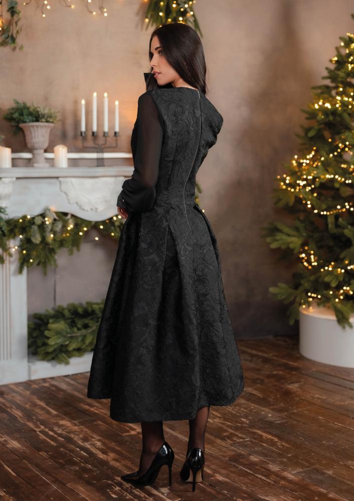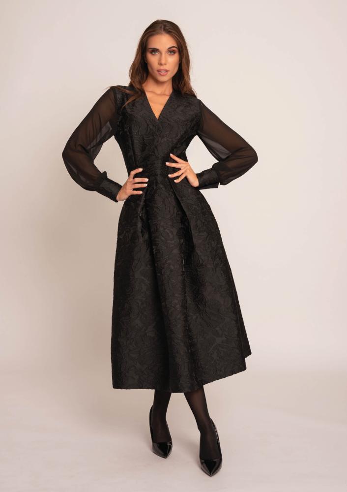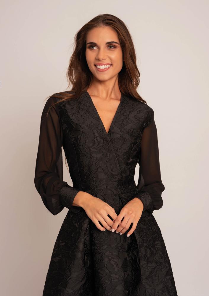 Fekete színű, elegáns Magenta ruha, A-vonalú, felső része átlapolt megoldással, muszlin ujjal, szoknyarészén hajtásokkal díszített, hátán zippzáras záródással.