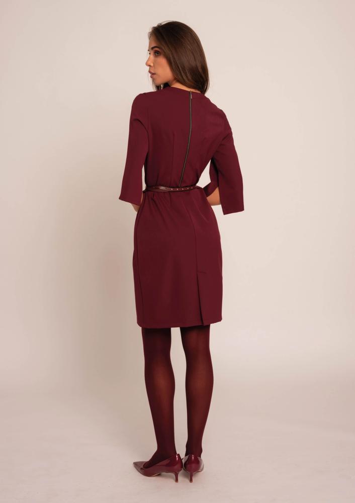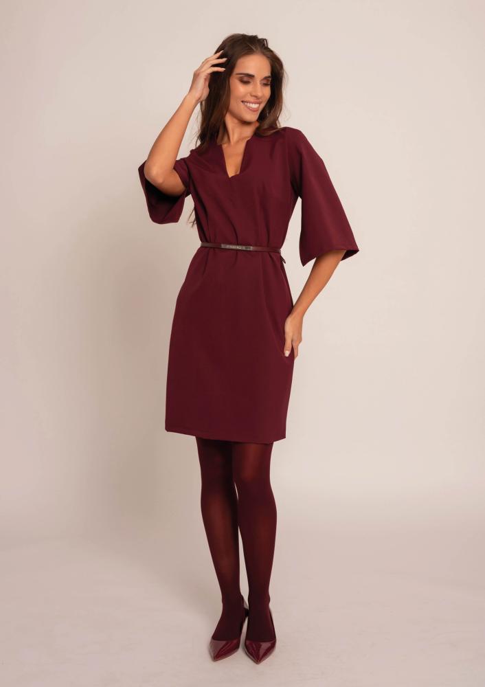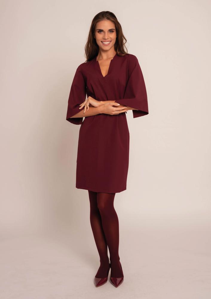 Bordó színű, kevert szálas Magenta ruha, szűkebb fazonú, V-nyakkivágással, 3/4 ujjhosszal. Oldalán rávarrt textil Magenta márkajelzéssel.