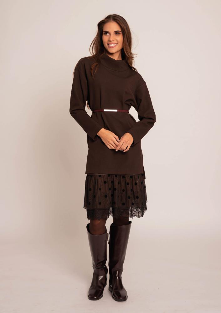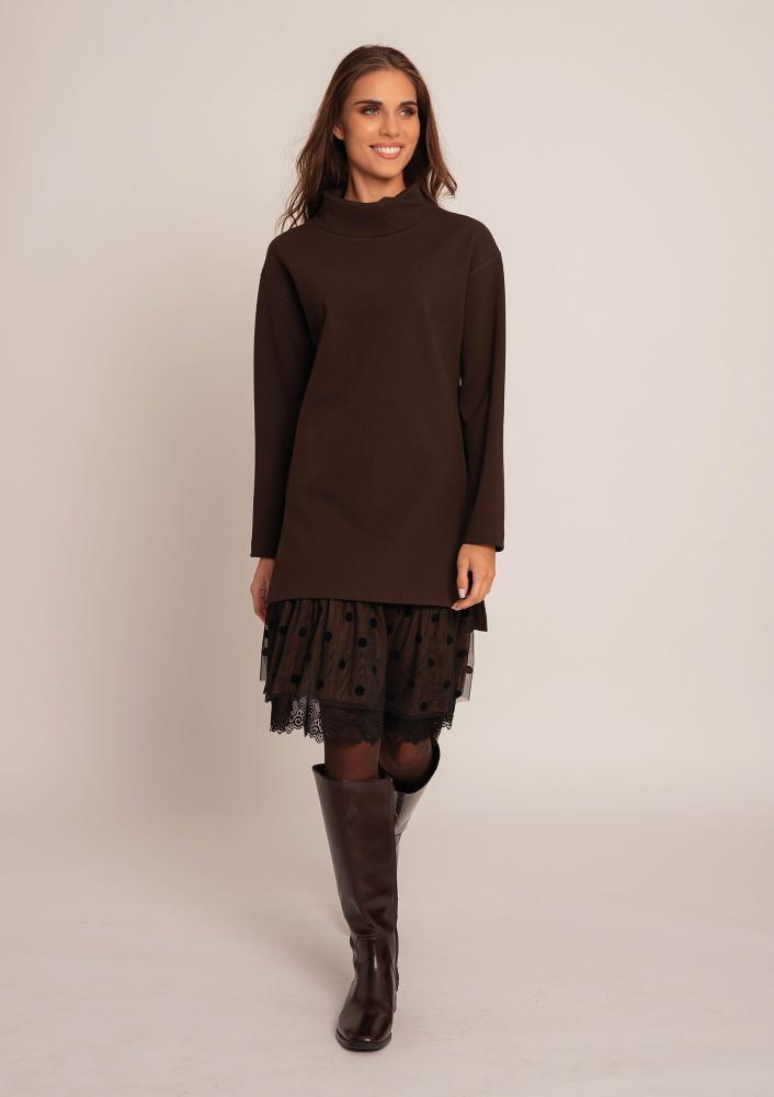 Barna színű, Magenta tunika, laza fazonú, ejtett vállrésszel, magas álló gallérral, oldalán hasítékkal.