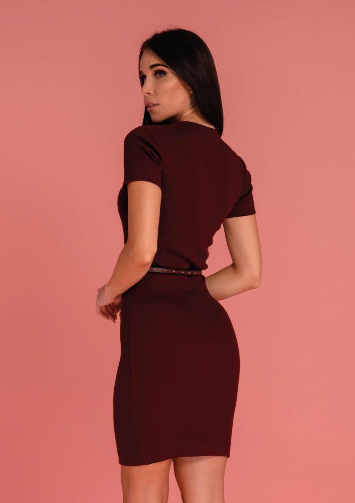Bordó színű, bordás anyagú pamut Magenta ruha, szűkebb fazonú, rövid ujjal, térd fölé érő hosszal.