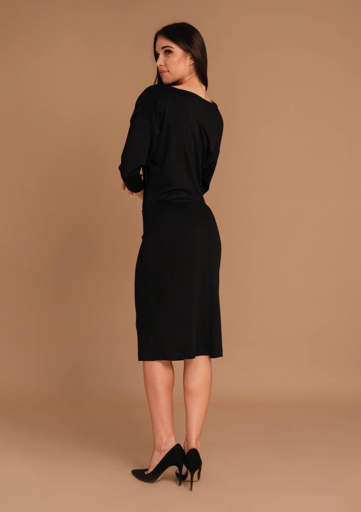 Fekete színű, elasztikus Magenta ruha, 3/4-es ujjhosszal, oldalán húzott részletekkel, arany díszítéssel, térdig érő. Oldalán rávarrt textil Magenta márkajelzés.