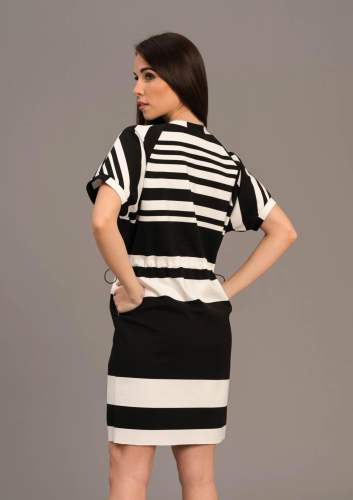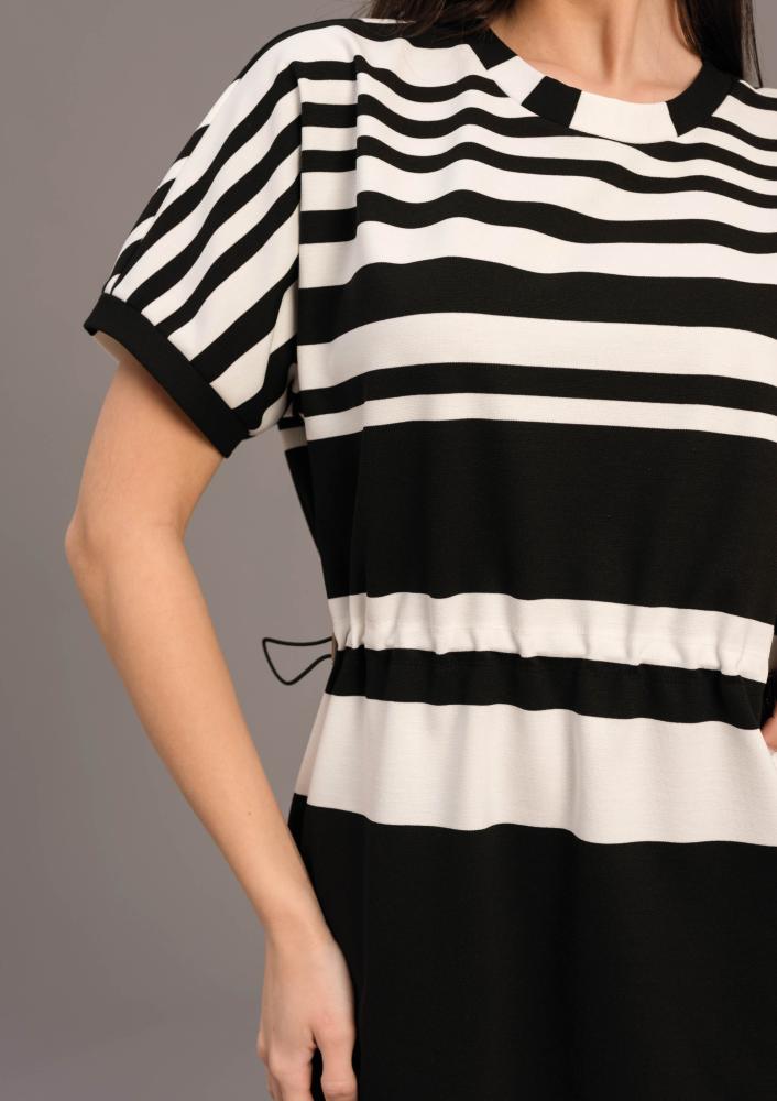 Csíkos, Magenta ruha, laza fazonú, rövid ujjú, derékrészen megkötővel. Oldalán rávarrt textil Magenta márkajelzés.