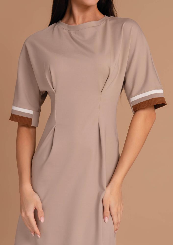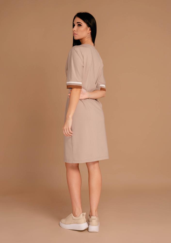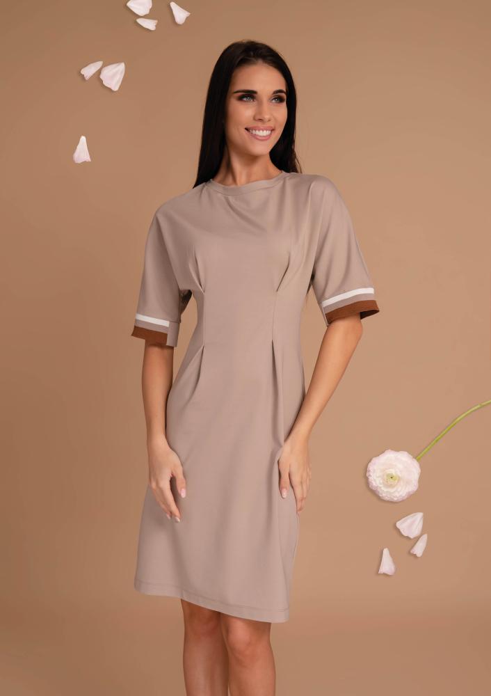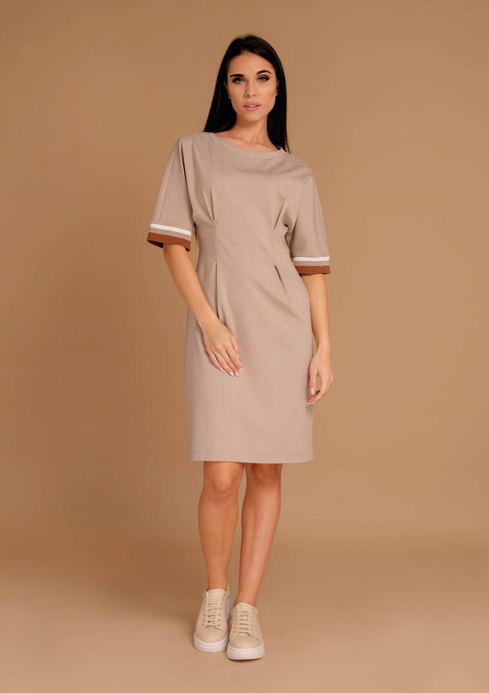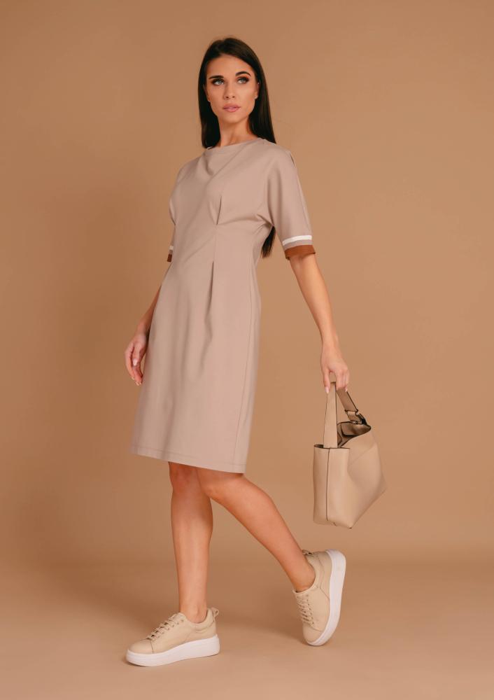 Bézs színű, elasztikus punto Magenta ruha, laza fazonú, kerek nyakkivágással, elején szűkítőkkel, ujján passzéval díszített. Oldalán rávarrt textil Magenta márkajelzés.