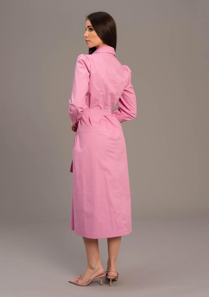 Rózsaszín színű, pamut-vászon Magenta maxi ingruha, hosszú ujjal, elején gombos záródással, derékrészen saját anyagából megkötővel. Oldalán rávarrt textil Magenta márkajelzés.