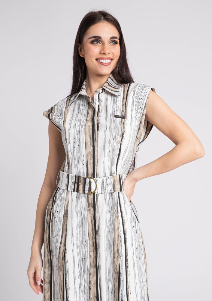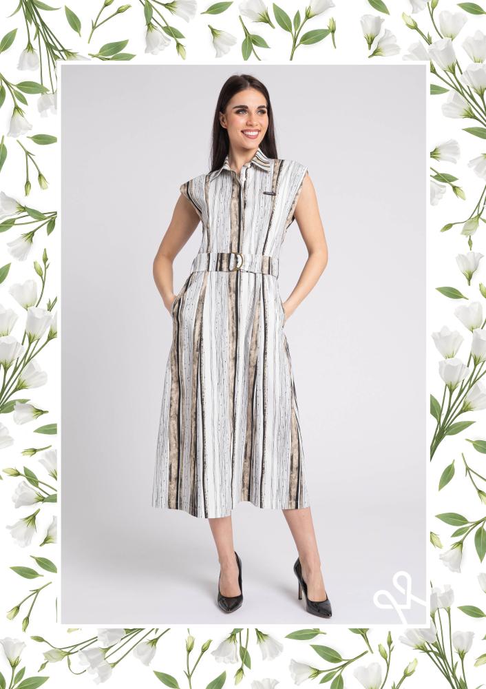 Csíkos, vászon hatású Magenta ingruha, elején gombos záródással, saját anyagából megkötővel, térd alá érő hosszal. Elején rávarrt Magenta márkajelzés.